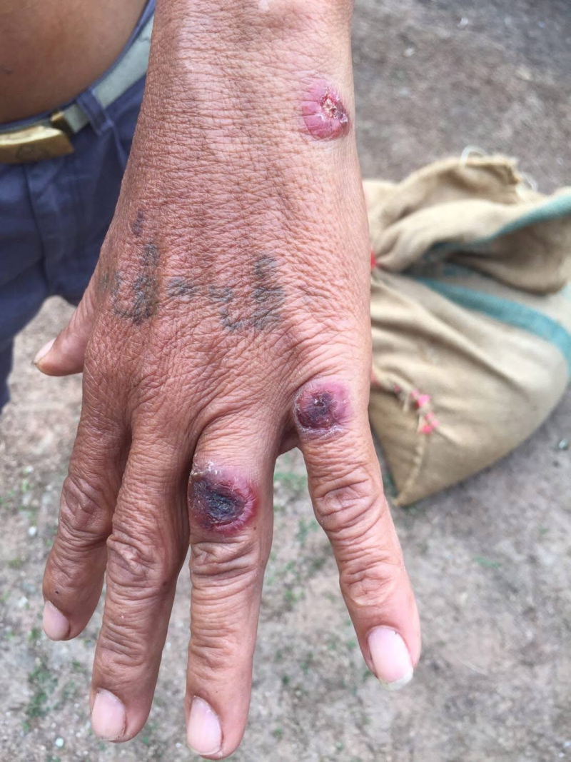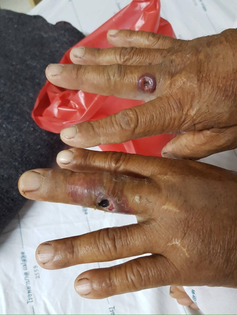 แอนแทรกซ์ผิวหนัง (Cutaneous Anthrax) เริ่มจากตุ่มคัน กลายเป็นแผลสีดำ (eschar) มีเนื้อตายล้อมด้วยวงบวมแดง