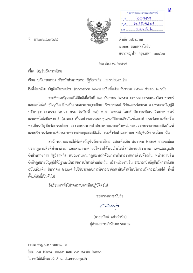 ประชาสัมพันธ์ บัญชีนวัตกรรมไทย (Innovation News) ฉบับเพิ่มเติม ธันวาคม 2567 จำนวน 2 หน้า