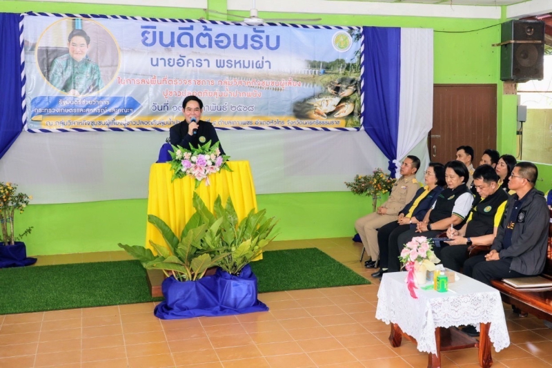 จากนั้นช่วงบ่ายตรวจเยี่ยมการดำเนินงานของกลุ่มวิสาหกิจชุมชนผู้เลี้ยงปูขาว ซึ่งเป็นแปลงใหญ่ปูทะเลแปลงแรกของกรมประมง และของประเทศไทย เป็นแปลงใหญ่ต้นแบบในพื้นที่จังหวัดนครศรีธรรมราช มีการพัฒนาการเลี้ยงปูทะเลแบบเชิงพาณิชย์ ร่วมพบปะเกษตรกรในพื้นที่และรับฟังสรุปผลการดำเนินงานการของกลุ่ม พร้อมทั้งมอบพันธุ์ปูะเล และปลากะพงขาวให้เกษตรกร ณ กลุ่มวิสาหกิจชุมชนผู้เลี้ยงปูขาวปลอดภัยลุ่มน้ำปากพนัง ต.เกาะเพชร อ.หัวไทร จ.นครศรีธรรมราช