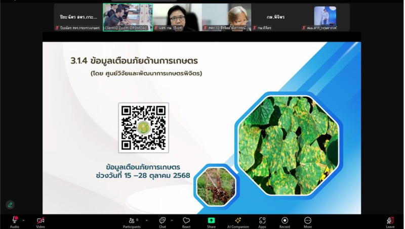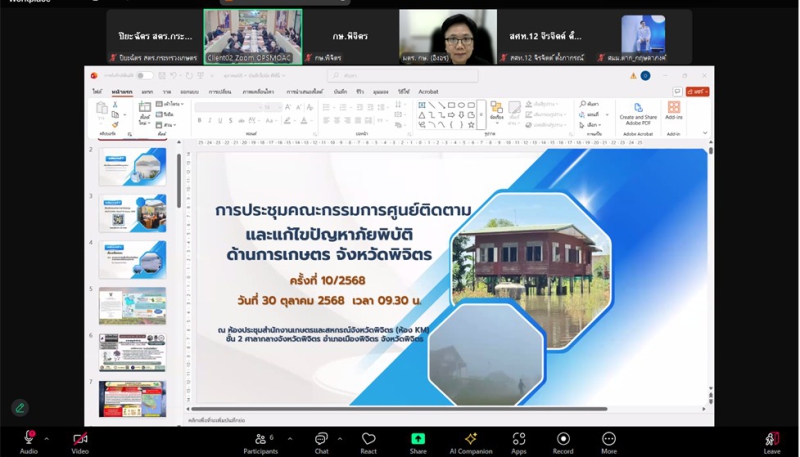 วันพฤหัสบดีที่ 30 ตุลาคม พ.ศ. 2568 เวลา 09.30 น. ณ ห้องประชุมสำนักตรวจราชการ (ห้อง 1406). และผ่านระบบประชุมทางไกลออนไลน์ นางสาวอิงอร ปัญญากิจ ผู้ตรวจราชการกระทรวงเกษตรและสหกรณ์ เป็นประธานการประชุมคณะกรรมการศูนย์ติดตามและแก้ไขปัญหาภัยพิบัติด้านการเกษตรจังหวัดพิจิตร ครั้งที่ 10/2568 พร้อมด้วยนางสาวอุไรรัตน์ คำชื่นวงศ์) เกษตรและสหกรณ์จังหวัดพิจิตร ในฐานะฝ่ายเลขานุการการประชุมฯ คณะกรรมการศูนย์ติดตามและแก้ไขปัญหาภัยพิบัติด้านการเกษตรฯ และเจ้าหน้าที่ที่เกี่ยวข้อง เข้าร่วมประชุมคณะกรรมการศูนย์ติดตามและแก้ไขปัญหาภัยพิบัติด้านการเกษตรจังหวัดพิจิตร ฯ ที่ประชุมรับรองรายงานการประชุม ครั้งที่ 9/2568 และรับทราบรายงานสถานการณ์ทั่วไปในพื้นที่จังหวัดพิจิตร และการแจ้งเตือนภัย สถานการณ์ในพื้นที่จังหวัด สถานการณ์นำ และแผนการบริหารจัดการน้ำ สถานการณ์การผลิตด้านการเกษตร (ด้านพืช,ประมง,ปศุสัตว์) และการเฝ้าระวังโรคระบาดในช่วงฤดูฝน ข้อมูลเตือนภัยการเกษตร ประกาศเขตพื้นที่ประสบสาธารณภัย และเขตการให้ความช่วยเหลือผู้ประสบภัยพิบัติกรณีฉุกเฉิน อุทกภัย และพื้นที่การเกษตรที่เสียหายจากสถานการณ์อุทกภัย ปี 2568 (ด้านพืช,ประมง,ปศุสัตว์)
