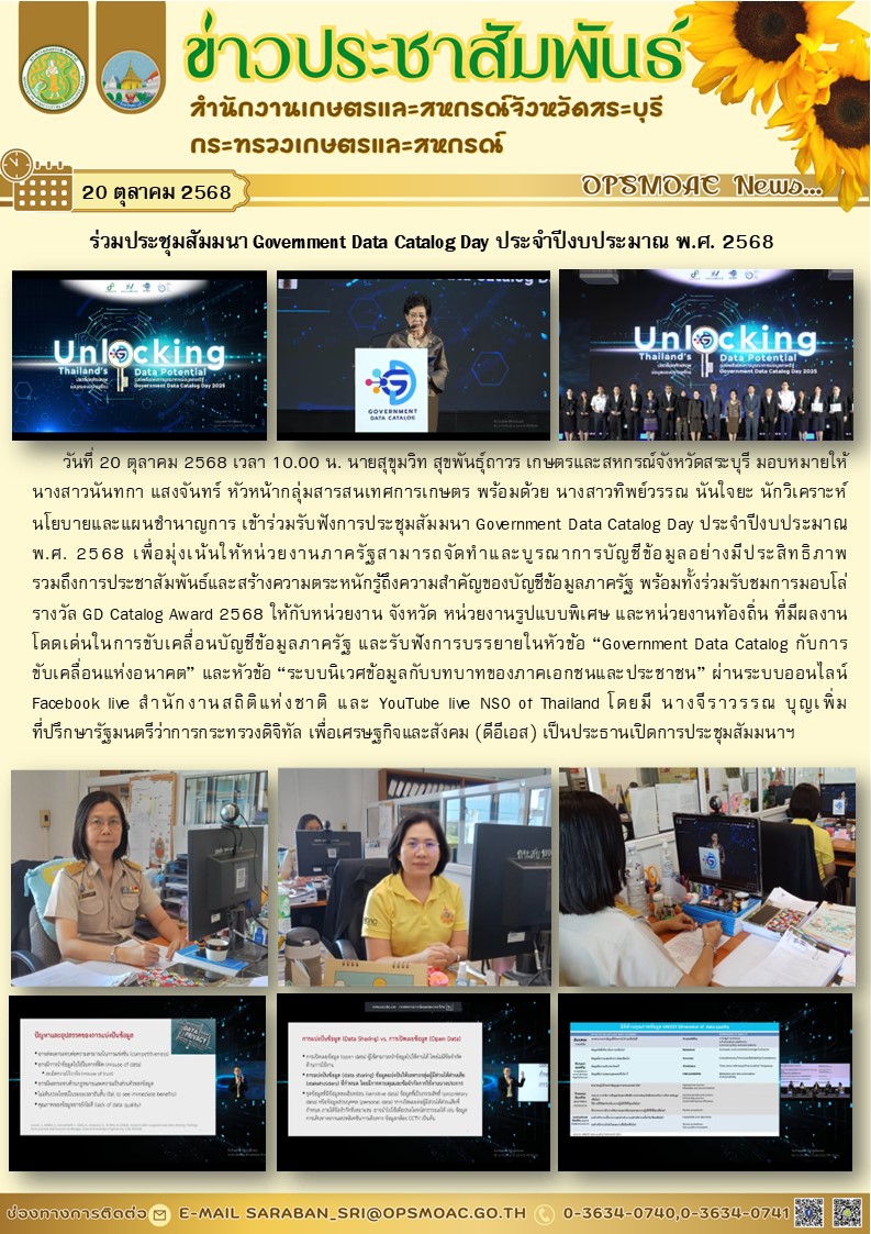 วันที่ 20 ตุลาคม 2568 เวลา 10.00 น. นายสุขุมวิท สุขพันธุ์ถาวร เกษตรและสหกรณ์จังหวัดสระบุรี มอบหมายให้ นางสาวนันทกา แสงจันทร์ หัวหน้ากลุ่มสารสนเทศการเกษตร พร้อมด้วย นางสาวทิพย์วรรณ นันใจยะ นักวิเคราะห์นโยบายและแผนชำนาญการ เข้าร่วมรับฟังการประชุมสัมมนา Government Data Catalog Day ประจปีงบประมาณ พ.ศ. 2568 เพื่อมุ่งเน้นให้หน่วยงานภาครัฐสามารถจัดทำและบูรณาการบัญชีข้อมูลอย่างมีประสิทธิภาพ รวมถึงการประชาสัมพันธ์และสร้างความตระหนักรู้ถึงความสำคัญของบัญชีข้อมูลภาครัฐ พร้อมทั้งร่วมรับชมการมอบโล่รางวัล GD Catalog Award 2568 ให้กับหน่วยงาน จังหวัด หน่วยงานรูปแบบพิเศษ และหน่วยงานท้องถิ่น ที่มีผลงานโดดเด่นในการขับเคลื่อนบัญชีข้อมูลภาครัฐ และรับฟังการบรรยายในหัวข้อ “Government Data Catalog กับการขับเคลื่อนแห่งอนาคต” และหัวข้อ “ระบบนิเวศข้อมูลกับบทบาทของภาคเอกชนและประชาชน” ผ่านระบบออนไลน์ Facebook live สำนักงานสถิติแห่งชาติ และ YouTube live NSO of Thailand โดยมี นางจีราวรรณ บุญเพิ่ม ที่ปรึกษารัฐมนตรีว่าการกระทรวงดิจิทัล เพื่อเศรษฐกิจและสังคม (ดีอีเอส) เป็นประธานเปิดการประชุมสัมมนาฯ