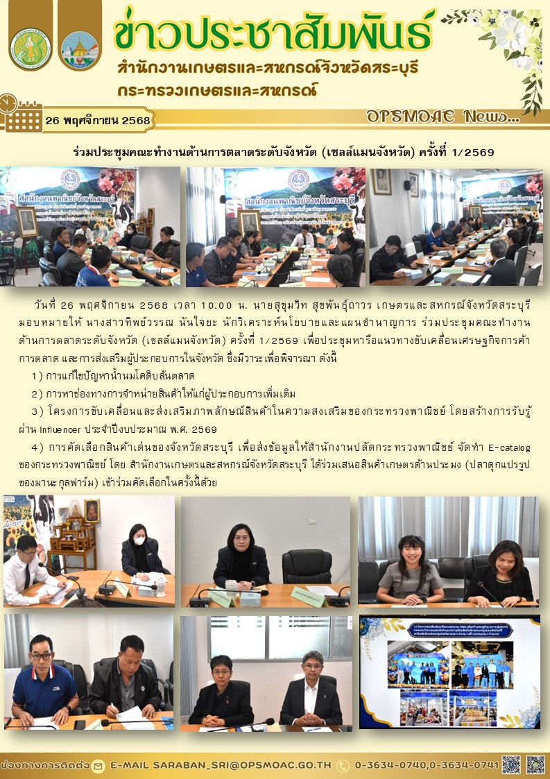 วันที่ 26 พฤศจิกายน 2568 เวลา 10.00 น. นายสุขุมวิท สุขพันธุ์ถาวร เกษตรและสหกรณ์จังหวัดสระบุรี มอบหมายให้ นางสาวทิพย์วรรณ นันใจยะ นักวิเคราะห์นโยบายและแผนชำนาญการ ร่วมประชุมคณะทำงาน ด้านการตลาดระดับจังหวัด (เซลล์แมนจังหวัด) ครั้งที่ 1/2569 เพื่อประชุมหารือแนวทางขับเคลื่อนเศรษฐกิจการค้า การตลาด และการส่งเสริมผู้ประกอบการในจังหวัด ซึ่งมีวาระเพื่อพิจารณา ดังนี้