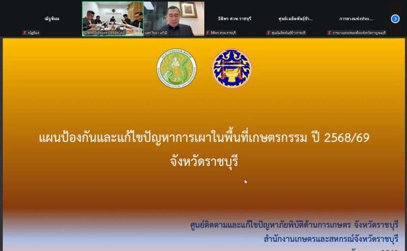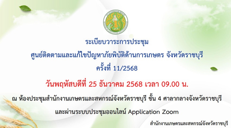 วันพฤหัสบดีที่ 25 ธันวาคม 2568 นายวิทยา แก้วมี ผู้ตรวจราชการกระทรวงเกษตรและสหกรณ์ เขตตรวจราชการที่ 3 เป็นประธานการประชุมคณะกรรมการศูนย์ติดตามและแก้ไขปัญหาภัยพิบัติด้านการเกษตรจังหวัดราชบุรี ครั้งที่ 11/2568 เวลา 09.00 น. ผ่านระบบประชุมออนไลน์ Application Zoom พร้อมด้วย นางสาวสุภาวรรณ เพ็ชศรี เกษตรและสหกรณ์จังหวัดราชบุรี ในฐานะฝ่ายเลขานุการการประชุมฯ คณะกรรมการศูนย์ติดตามและแก้ไขปัญหาภัยพิบัติด้านการเกษตรฯ และเจ้าหน้าที่ที่เกี่ยวข้องเข้าร่วมประชุมคณะกรรมการศูนย์ติดตามและแก้ไขปัญหาภัยพิบัติด้านการเกษตรจังหวัดราชบุรี โดยขอให้เจ้าหน้าที่ทำความเข้าใจแผนป้องกันและบรรเทา