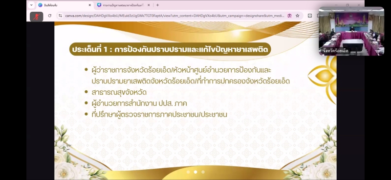 ทั้งนี้ ที่ประชุมได้ให้ข้อคิดเห็นให้ความสำคัญในเรื่องของการบำบัดผู้ติดยาเสพติดในพื้นที่ และวิธีการจัดการอย่างมาก การบูรณาการร่วมกันในพื้นที่ทั้งภาครัฐ และภาคเอกชน นวัตกรรมใหม่ ๆ นำมาผสมผสาน รวมทั้งการยกระดับการท่องเที่ยวเพื่อสร้างรายได้ ควรมีการประชาสัมพันธ์การท่องเที่ยวของจังหวัดทุกช่องทาง และเน้นป้องกันเพื่อไม่ให้ผู้ติดเสพติดซ้ำ