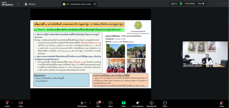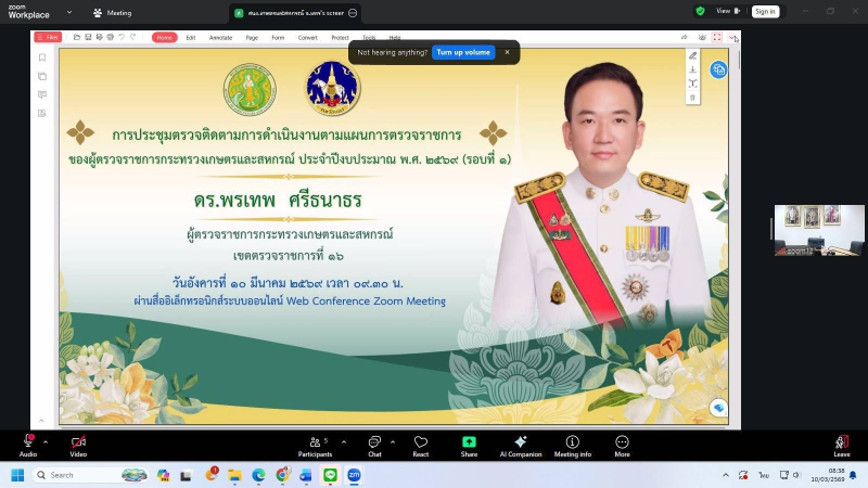 วันอังคารที่ 10 มีนาคม 2569 เวลา 09.30 น ผู้ตรวจราชการกระทรวงเกษตรและสหกรณ์ เขตตรวจราชการที่ 16 (ดร.พรเทพ ศรีธนาธร) เป็นประธานการประชุมตรวจติดตามความก้าวหน้าผลการดำเนินงานตามแผนการตรวจราชการ ประจำปีงบประมาณ พ.ศ. 2569 รอบที่ 1 จังหวัดแพร่ ่ผ่านระบบประชุมทางไกลออนไลน์ (Zoom Cloud Meeting) โดยมีเกษตรและสหกรณ์จังหวัดแพร่ (นายมนูญ รัตนอุบล),หัวหน้าส่วนราชการในสังกัดกระทรวงเกษตรฯ รวมทั้งเจ้าหน้าที่ที่เกี่ยวข้อง , ผู้ช่วยผู้ตรวจราชการกระทรวงทั้งส่วนกลาง และภูมิภาค เข้าร่วมประชุมโดยพร้อมเพรียง ทั้งนี้ในการประชุม ประธานฯได้แจ้งให้ทราบแนวทางการสร้างความตระหนักรู้ด้านคุณธรรมและจริยธรรม เพื่อส่งเสริมคุณธรรม จริยธรรม และป้องกันการทุจริตของบุคลากรในสังกัดสำนักงานปลัดกระทรวงเกษตรและสหกรณ์ จากนั้นที่ประชุม ได้รับฟังการรายงานเกี่ยวกับภัยพิบัติในพื้นที่ เช่น ปัญหา PM 2.5 ซึ่งในจังหวัดแพร่ถือว่าอยู่ในระดับที่ไม่เป็นอันตรายต่อสุขภาพ ที่ประชุมได้พิจารณารายงานผลการดำเนินงานโครงการภายใต้กรอบนโยบายสำคัญ 6 ด้านของกระทรวงเกษตรและสหกรณ์ ได้แก่: การเร่งรัดการจัดที่ดินทำกินให้แก่เกษตรกร ,การบริหารจัดการน้ำอย่างเป็นระบบ เพื่อการยกระดับสินค้าเกษตรและบริการมูลค่าสูง ,การเสริมสร้างศักยภาพเกษตรกรและสถาบันเกษตรกร ,การจัดการทรัพยากรทางการเกษตร ,การป้องกันและปราบปรามสินค้าเกษตรผิดกฎหมาย (สงครามสินค้าเกษตร) โดย ผู้ตรวจราชการเขต 16 และผู้ช่วยผู้ตรวจฯ ได้ให้ข้อเสนอแนะในประเด็นต่างๆ อาทิ การเร่งรัดการเบิกจ่ายงบประมาณให้เป็นไปตามแผนและกรอบเวลา แนวทางการบูรณาการขับเคลื่อนกิจกรรมเพื่อให้เกิดประโยชน์ต่อเกษตรกร การแก้ไขปัญหาอุปสรรค รวมถึงเน้นย้ำการขับเคลื่อนตามข้อสั่งการของรมว. กษ และ รมช. กษ จากการลงพื้นที่ให้เกิดความคืบหน้าพร้อมรายงานให้ส่วนกลางทราบต่อไป ผู้ตรวจราชการฯ ได้เน้นยำ้ความสำคัญของการดำเนินโครงการอันเนื่องมาจากพระราชดำริในส่วนที่เกี่ยวข้องกับกระทรวงเกษตรฯ โดยขอให้หน่วยงานที่เกี่ยวข้องติดตามการดำเนินการตามข้อเสนอแนะขององคมนตรี การประสานบูรณาการกับหน่วยงานในเรื่อง One Plan และการขับเคลื่อนภารกิจของพื้นที่ในส่วนที่เกี่ยวข้องกับโครงการพระราชดำริ