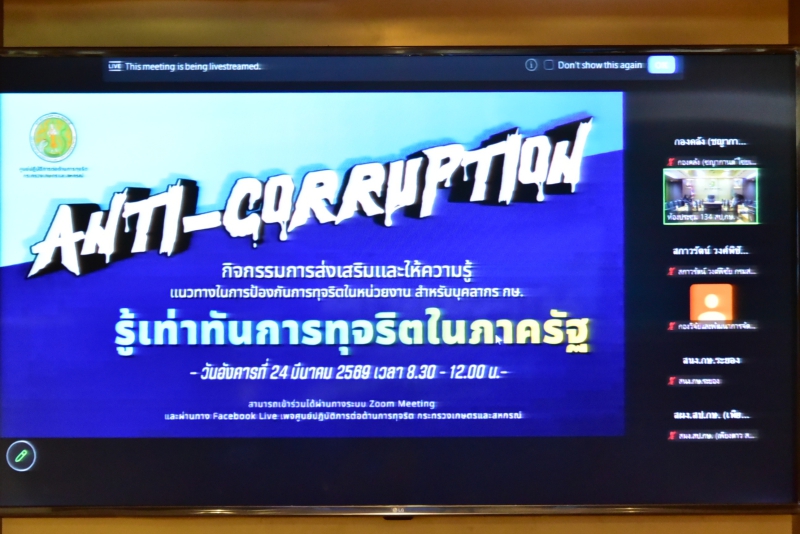 นางสาวทัศนีย์ เมืองแก้ว รองปลัดกระทรวงเกษตรและสหกรณ์ เป็นประธานเปิดกิจกรรมการส่งเสริมและให้ความรู้แนวทางการป้องกันการทุจริตในหน่วยงาน สำหรับบุคลากรกระทรวงเกษตรและสหกรณ์ ภายใต้หัวข้อ “รู้เท่าทันการทุจริต ในภาครัฐ” ประจำปีงบประมาณ พ.ศ. 2569 ณ ห้องประชุม 134 กระทรวงเกษตรและสหกรณ์ โดยมีบุคลากรของกระทรวงเกษตรและสหกรณ์ ทั้งส่วนกลาง ส่วนภูมิภาค และสำนักงานที่ปรึกษาการเกษตรต่างประเทศเข้าร่วม จำนวน 1,131 คน ผ่านระบบการประชุมออนไลน์ (Zoom Meeting) และผ่าน Facebook Live : ศูนย์ปฏิบัติการต่อต้านการทุจริต กระทรวงเกษตรเเละสหกรณ์ โดยกิจกรรมดังกล่าวมีวัตถุประสงค์เพื่อเสริมสร้างความรู้ความเข้าใจเกี่ยวกับกฎหมาย ระเบียบ หลักเกณฑ์ และแนวปฏิบัติที่เกี่ยวข้องกับการป้องกันการทุจริต การขับเคลื่อนนโยบาย No Gift Policy จากการปฏิบัติหน้าที่เเละให้ความรู้เรื่องหลักเกณฑ์การรับทรัพย์สิน หรือประโยชน์อื่นใดโดยธรรมจรรยาของเจ้าหน้าที่รัฐ ซึ่งเป็นการส่งเสริมให้บุคลากรปฏิบัติหน้าที่ด้วยความซื่อสัตย์สุจริต โปร่งใส และตรวจสอบได้ตามหลักธรรมาภิบาล นอกจากนี้ยังเป็นการสร้างเครือข่าย ในการเฝ้าระวังและป้องกันการทุจริต รวมถึงเพื่อสนับสนุนการยกระดับมาตรฐานคุณธรรมและความโปร่งใสในการปฏิบัติงาน