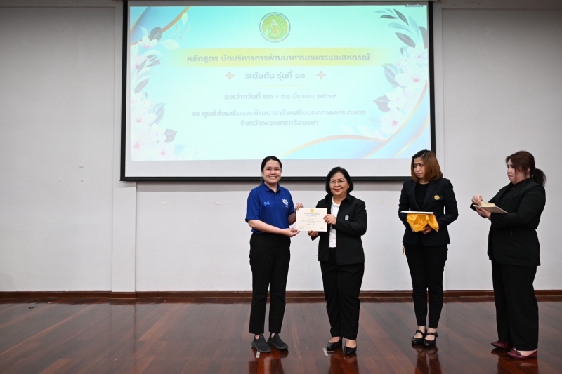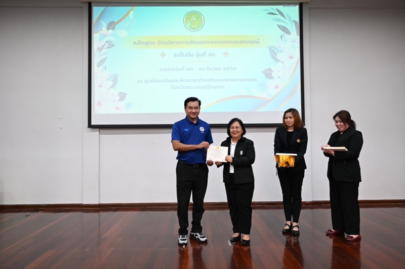 วันที่ 31 มีนาคม 2569 นางสาวทัศนีย์ เมืองแก้ว รองปลัดกระทรวงเกษตรและสหกรณ์ เป็นประธานพิธีปิดและมอบประกาศนียบัตรแก่ผู้ผ่านการฝึกอบรมหลักสูตร นักบริหารการพัฒนาการเกษตรและสหกรณ์ ระดับต้น (นบต.) รุ่นที่ 80 โดยมีนางวรรณ์ภัสสร ศรีจันทร์ ผู้อำนวยการสถาบันเกษตราธิการ เป็นผู้กล่าวรายงาน พร้อมด้วยผู้เข้าอบรมจากหน่วยงานในสังกัดกระทรวงเกษตรและสหกรณ์ จำนวน 100 คน และเจ้าหน้าที่ที่มีส่วนเกี่ยวข้องเข้าร่วม ณ หอประชุมหม่อมราชวงศ์หญิงรสลิน คัคณางค์ ศูนย์ส่งเสริมและพัฒนาอาชีพเสริมนอกภาคการเกษตร บางไทร สำนักงานการปฏิรูปที่ดินเพื่อเกษตรกรรม (ส.ป.ก.) ต.ช้างใหญ่ อ.บางไทร จ.พระนครศรีอยุธยา