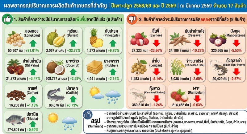 ทั้งนี้ จากผลพยากรณ์ ณ เดือนมีนาคม 2569 พบว่าสินค้าเกษตรจำนวน 9 สินค้า มีแนวโน้มผลผลิตเพิ่มขึ้นจากปีก่อน ได้แก่ ลองกอง ทุเรียน สับปะรด ปาล์มน้ำมัน มะพร้าว ยางพารา กาแฟ ปลาดุก และปลานิล ขณะที่อีก 8 สินค้ามีแนวโน้มผลผลิตลดลง ได้แก่ ลิ้นจี่ มันสำปะหลัง มังคุด ลำไย ข้าวนาปรัง กุ้งกุลาดำ กุ้งขาวแวนนาไม และเงาะ โดยมีปัจจัยสำคัญจากสภาพอากาศแปรปรวน ปริมาณฝนที่แตกต่างกันในแต่ละพื้นที่ ราคาสินค้าและแรงจูงใจในการเพาะปลูก ตลอดจนต้นทุนการผลิตและสถานการณ์โรคระบาดในสัตว์น้ำ ซึ่งข้อมูลดังกล่าวจะเป็นฐานสำคัญในการวางแผนบริหารจัดการสินค้าเกษตรให้สอดคล้องกับสถานการณ์อย่างมีประสิทธิภาพต่อไป