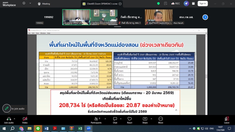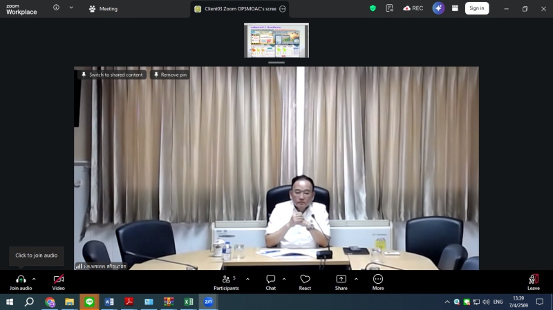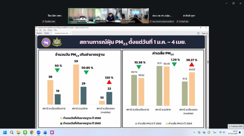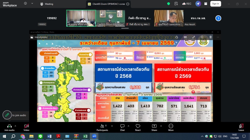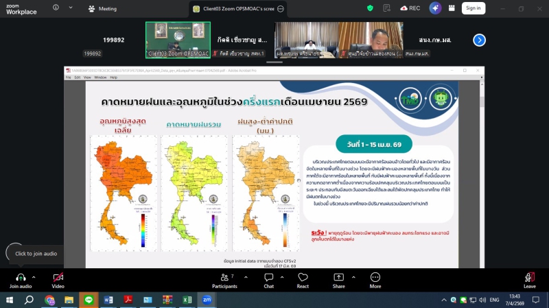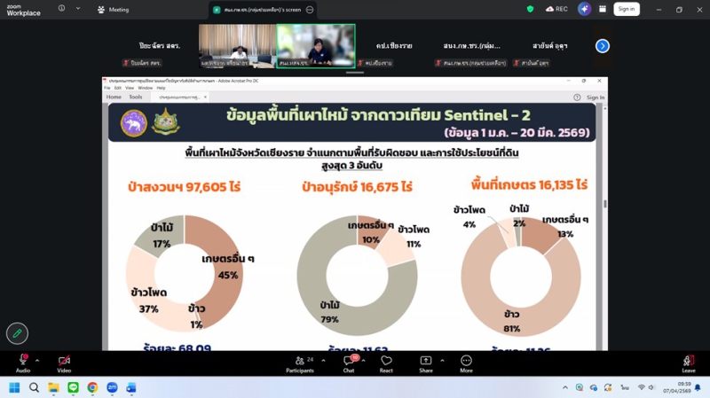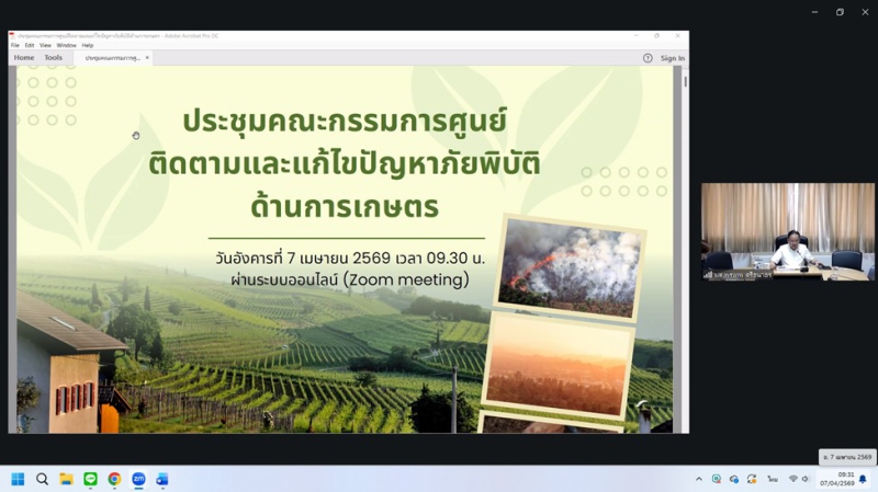 วันอังคารที่ 7 เมษายน 2569 ดร.พรเทพ ศรีธนาธร ผู้ตรวจราชการกระทรวงเกษตรและสหกรณ์ เขตตรวจราชการที่ 15 และ 16 เป็นประธานการประชุมติดตามการดำเนินงานของศูนย์ติดตามและแก้ไขปัญหาภัยพิบัติด้านการเกษตรในพื้นที่จังหวัดเชียงรายและแม่ฮ่องสอน เพื่อขับเคลื่อนมาตรการป้องกันไฟป่า หมอกควัน และการบริหารจัดการน้ำ ผ่านระบบออนไลน์ Zoom meeting ณ ห้องประชุมสำนักตรวจราชการ โดยในช่วงเช้า เวลา 09.30 น. เป็นประธานการประชุมฯ ศูนย์ติดตามฯจังหวัดเชียงราย ในประเด็นไฟป่า จุดความร้อน (Hotspot) ในพื้นที่ป่าและเกษตร โดยกำชับให้หน่วยงานเฝ้าระวังและบูณาการการทำงานร่วมกัน รวมถึงการจัดการน้ำ อ่างเก็บน้ำ ในเขตชลประทาน ให้มีประสิทธิภาพสูงสุดเพื่อป้องกันผลผลิตเสียหายในช่วงฤดูแล้ง
