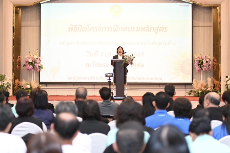นางสาวทัศนีย์ เมืองแก้ว รองปลัดกระทรวงเกษตรและสหกรณ์ เป็นประธานในพิธีปิดการฝึกอบรมหลักสูตรนักบริหารการพัฒนาการเกษตรและสหกรณ์ ระดับสูง (นบส.) รุ่นที่ 92 ณ โรงแรมมารวยการ์เด้น เขตจตุจักร กรุงเทพมหานคร โดยมีผู้บริหาร คณะกรรมการ วิทยากร และผู้เข้ารับการฝึกอบรมเข้าร่วม จัดโดย สถาบันเกษตราธิการ สำนักงานปลัดกระทรวงเกษตรและสหกรณ์ ระหว่างวันที่ 23 กุมภาพันธ์ – 3 เมษายน 2569 ในรูปแบบการเรียนรู้แบบผสมผสาน (Blended Learning) เพื่อเพิ่มพูนทักษะด้านการบริหารเชิงยุทธศาสตร์ การบริหารจัดการตนเอง และการพัฒนาบุคลากร และพัฒนาศักยภาพบุคลากรให้มีความพร้อมในการก้าวสู่การเป็นผู้บริหารระดับสูงของกระทรวงเกษตรและสหกรณ์