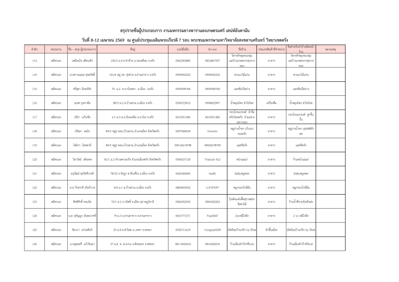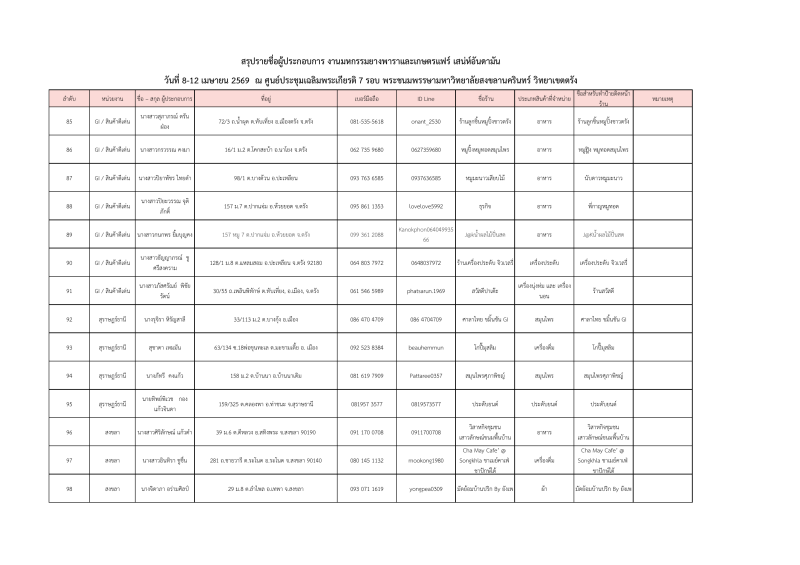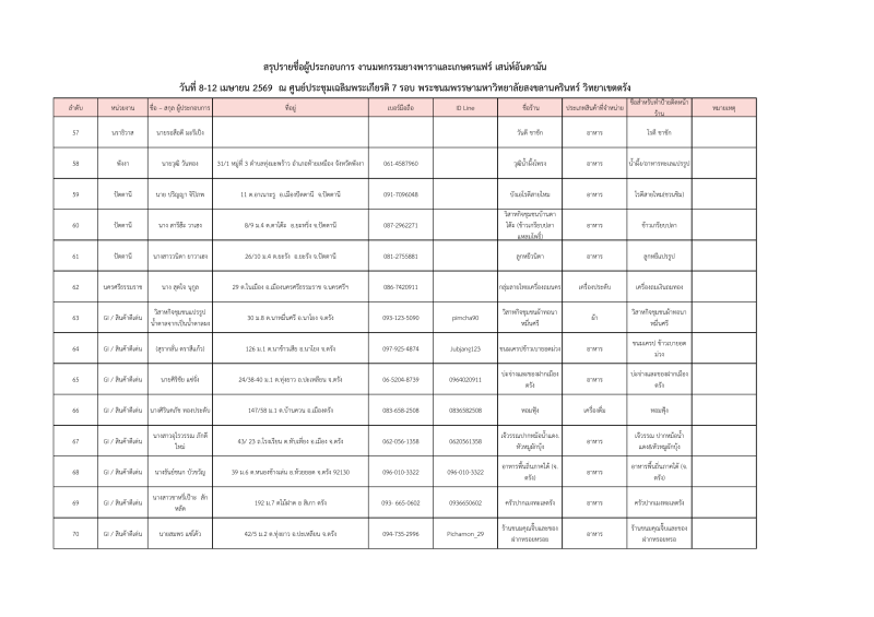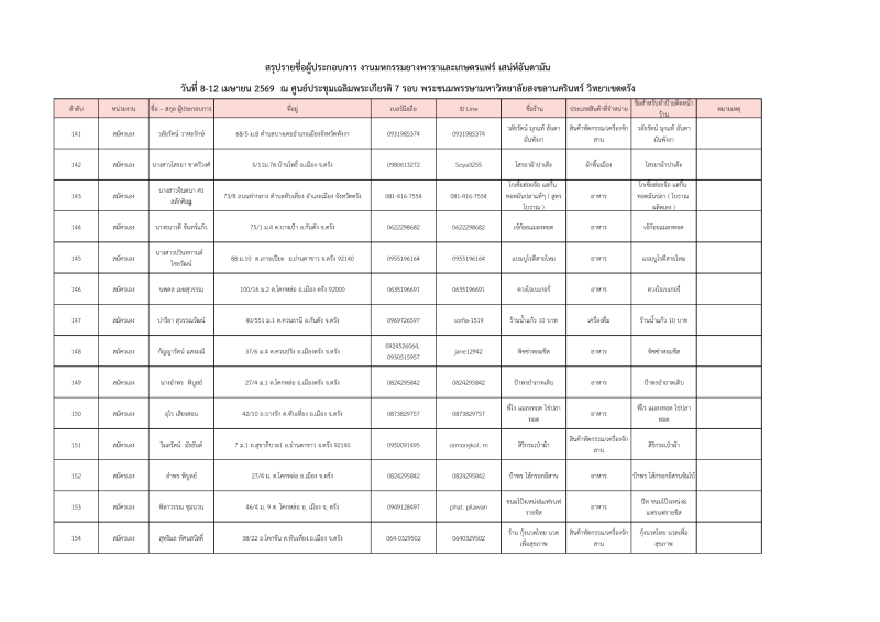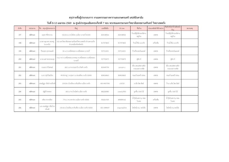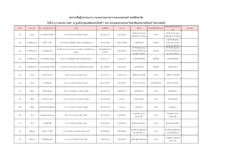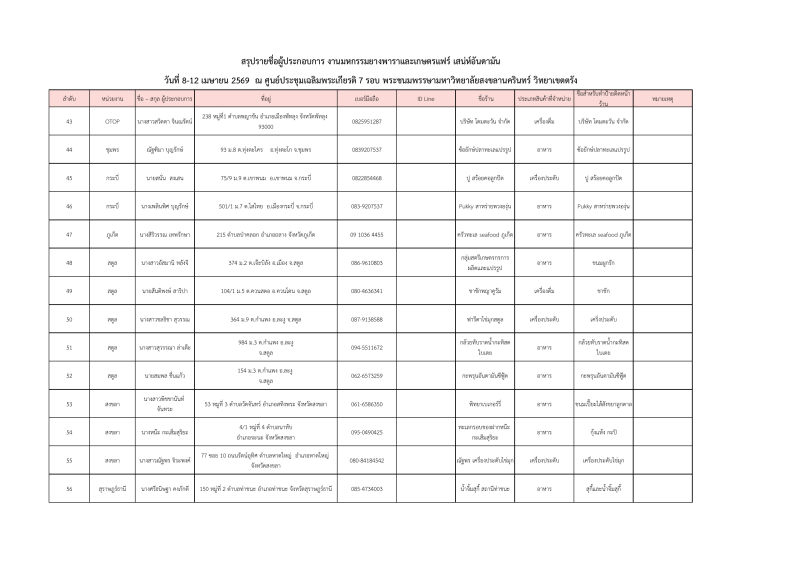 รายชื่อผู้ประกอบการที่ผ่านการคัดเลือกออกบูธจำหน่ายสินค้าโซนเกษตรแฟร์ งานมหกรรมยางพาราและเกษตรแฟร์ เสน่ห์อันดามัน ระหว่างวันที่ 8-12เมษายน 2569 ณ ศูนย์ประชุมฯมหาวิทยาลัยสงขลานครินทร์ วิทยาเขตตรัง