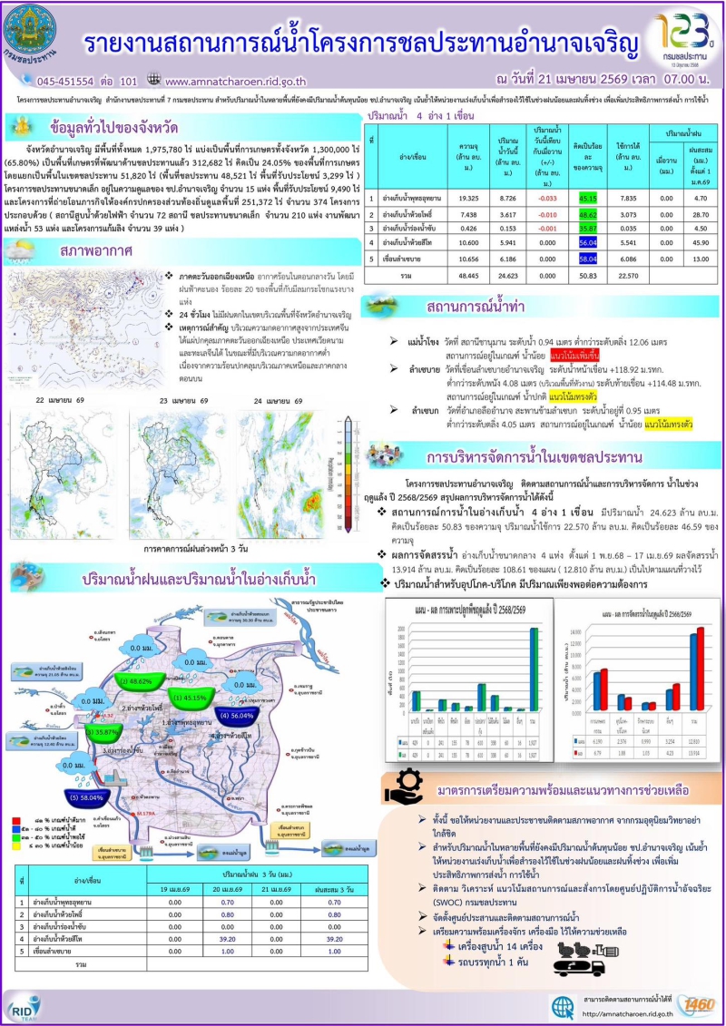 ข้อมูลสถานการณ์น้ำและบริหารจัดการน้ำ ณ วันอังคารที่ 21 เมษายน 2569
