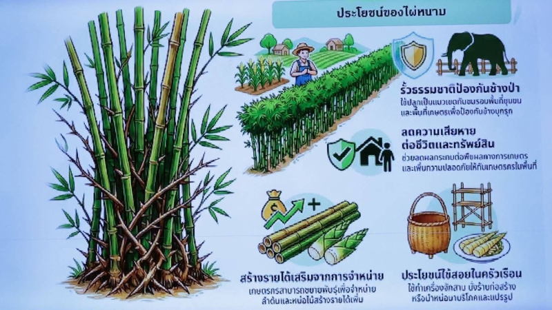 วันที่ 28 มกราคม 2568 เดินทางไปยังสวนพฤกษศาสตร์วังน้ำเย็น อำเภอวังน้ำเย็น จังหวัดสระแก้ว เพื่อติดตามผลการดำเนินงานโครงการนำร่องการปลูกไผ่หนามฯ ภายใต้โครงการพัชรสุธาคชานุรักษ์ กระทรวงเกษตรและสหกรณ์ ซึ่งได้เริ่มดำเนินการเมื่อปี 2568 ระยะทาง 400 เมตร (จำนวนต้นไผ่หนามที่ทดลองปลูก 800 ต้น) โดยมีวัตถุประสงค์สำคัญ เพื่อศึกษา ทดลอง และประเมินประสิทธิภาพของไผ่หนามในการเป็นรั้วธรรมชาติ ป้องกันช้างป่าเข้าสู่พื้นที่เพาะปลูก ซึ่งภายหลังการปลูก ระยะเวลา 8 เดือน พบว่า ไผ่หนามมีอัตราการรอด 100% และมีการเจริญเติบโตดี (ความสูงเพิ่มขึ้น 2 เท่า และมีการแตกกิ่งก้าน และมีหนามจำนวนมาก)