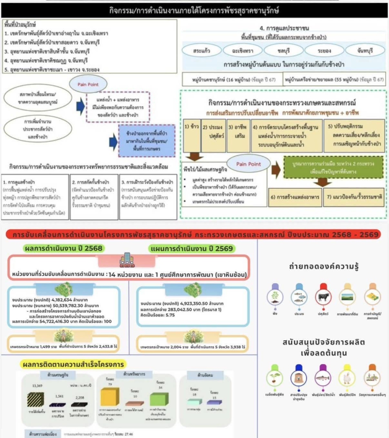 วันที่ 28 - 29 มกราคม 2569 ดร.พงศ์ไท ไทโยธิน ผู้ตรวจราชการกระทรวงเกษตรและสหกรณ์ พร้อมด้วยผู้อำนวยการกองประสานงานโครงการพระราชดำริ เกษตรและสหกรณ์จังหวัดสระแก้ว และทีมงาน ลงพื้นที่ติดตามผลการดำเนินงานโครงการนำร่องการปลูกไผ่หนามเป็นรั้วธรรมชาติเสริมแนวคูกันช้าง เพื่อป้องกันช้างป่าบุกรุกพื้นที่ชุมชนและพื้นที่การเกษตร ภายใต้โครงการพัชรสุธาคชานุรักษ์ กระทรวงเกษตรและสหกรณ์ และเข้าร่วมการประชุมเพื่อสื่อสารแผนปฏิบัติการโครงการพัชรสุธาคชานุรักษ์ ประจำปี 2569 ณ จังหวัดสระแก้ว