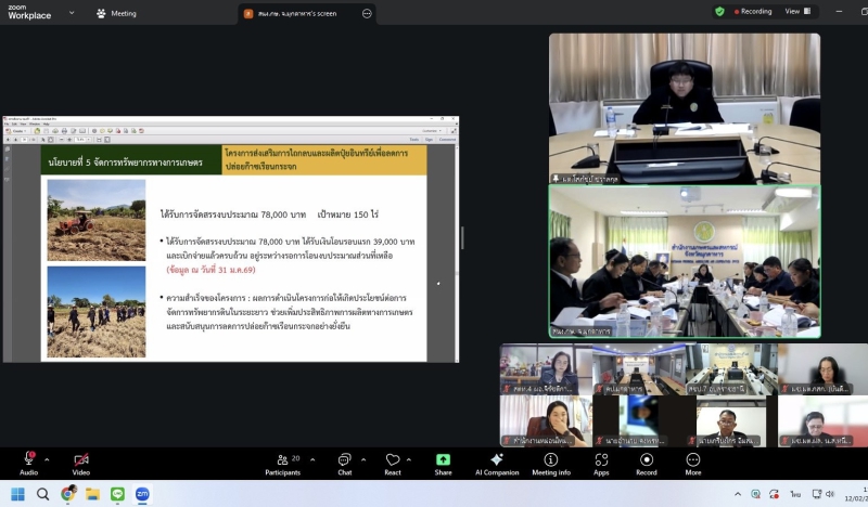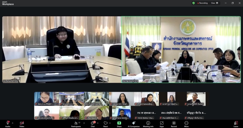 วันพฤหัสบดีที่ 12 กุมภาพันธ์ พ.ศ. 2569 ผู้ตรวจราชการกระทรวงเกษตรและสหกรณ์ (นายโสภัชย์ ชวาลกุล) เขตตรวจราชการที่ 11 เป็นประธานการประชุมตรวจติดตามความก้าวหน้าผลการดำเนินงานตามแผนการตรวจราชการ ของผู้ตรวจราชการกระทรวงเกษตรและสหกรณ์ ประจำปีงบประมาณ พ.ศ. 2569 รอบที่ 1 ในเขตตรวจราชการที่ 11 (จังหวัดมุกดาหาร) เวลา 09.30 น. โดยประชุมทางไกลผ่านสื่ออิเล็กทรอนิกส์ออนไลน์ Zoom meeting โดยมีผู้ช่วยผู้ตรวจราชการกระทรวงเกษตรและสหกรณ์ (ระดับกรม) เกษตรและสหกรณ์จังหวัด รวมทั้งหน่วยงานในสังกัดกระทรวงเกษตรและสหกรณ์ในพื้นที่เข้าร่วมประชุม โดยที่ประชุมฯรับทราบแผนการตรวจราชการตามคำสั่งกระทรวงเกษตรและสหกรณ์ที่ 918/2568