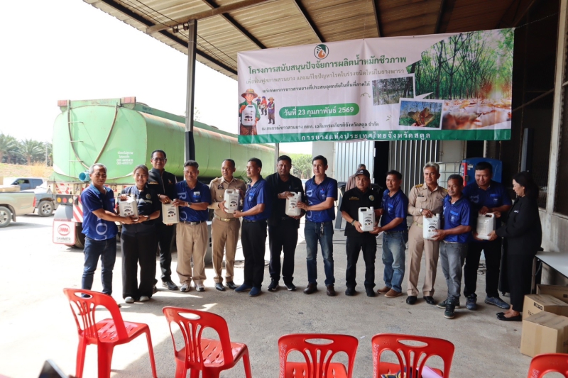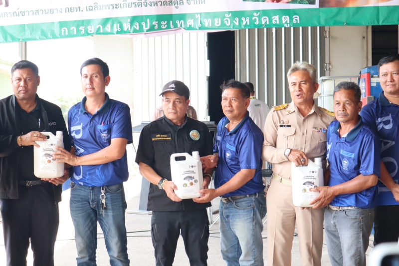 เวลา 14.00 น. ลงพื้นที่ ณ สหกรณ์ชาวสวนยาง กยท. เฉลิมพระเกียรติจังหวัดสตูล จำกัด เลขที่ 121 หมู่ที่ 3 ตำบลควนโดน อำเภอควนโดน จังหวัดสตูล พบปะพี่น้องเกษตรกรชาวสวนยางพาราจังหวัดสตูล ประมาณ 100 คน และเป็นประธานปล่อยขบวนรถสนับสนุนน้ำหมักชีวภาพจากวัตถุดิบปลาหมอคางดำ รวมทั้งตรวจติดตามการดำเนินงานสหกรณ์ชาวสวนยาง กยท. เฉลิมพระเกียรติจังหวัดสตูล จำกัด และเยี่ยมชมกิจการของสหกรณ์ เช่น 1. การจัดการรวบรวมน้ำยางดิบ ซึ่งได้รับมาตรฐาน ISO 2015 2. การลดต้นทุนการผลิต โดยการผสมปุ๋ยใช้เอง 3. กระบวนการผลิตยางแผ่นรมควัน 4. การบริหารจัดการเพื่อรักษาคุณภาพยางพาราแผ่นดิบ
