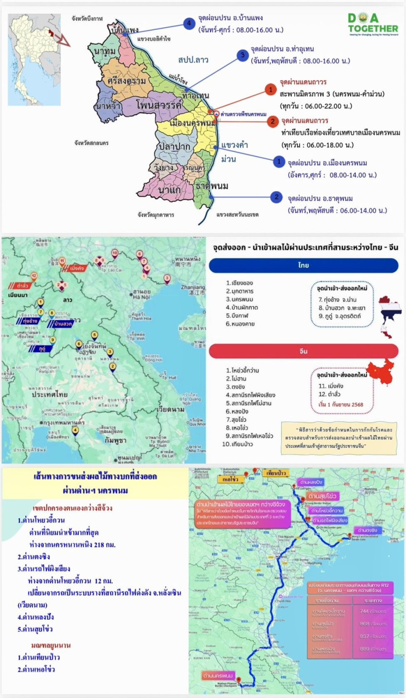 ผู้ตรวจราชการกระทรวงเกษตรและสหกรณ์ (ดร.พงศ์ไท ไทโยธิน) ตรวจติดตามความก้าวหน้าการขับเคลื่อนนโยบายเกษตรมูลค่าสูงของจังหวัดนครพนม ในโอกาสที่เดินทางมาร่วมงาน งานเกษตรลุ่มน้ำโขงครั้งที่ 17 ประจําปี พ.ศ. 2569 โดยเยี่ยมชมการดําเนินงานของด่านตรวจพืชนครพนม ซึ่งเป็นด่านส่งออกสินค้าเกษตรที่สําคัญของไทย โดยเฉพาะทุเรียน ลําไย และสินค้านำเข้าจากต่างประเทศ เช่น มันสำปะหลัง และมะม่วง เป็นต้น และหารือถึงสถานการณ์สินค้าเกษตรผิดกฏหมายที่อาจส่งผลกระทบต่อราคาผลผลิตทางการของเกษตรกรของไทย พร้อมทั้งชื่นชมศักยภาพการตรวจสินค้าขาเข้าเพื่อป้องกันศัตรูพืชกักกันที่อาจติดมากับสินค้าเกษตรนำเข้า ในการนี้เจ้าหน้าที่ด่านตรวจพืชฯได้รายงานแผนการเตรียมความพร้อมในการให้บริการออกใบรับรองสุขอนามัยพืชไปสาธารณรัฐประชาชนจีน และดำเนินการอำนวยความสะดวกการส่งออกทุเรียนในช่วงฤดูกาลที่จะถึงนี้ เพื่อไม่ให้เกิดปัญหาตู้คอนเทนเนอร์จอดรอบริเวณหน้าด่านตรวจพืชนครพนมเป็นเวลานาน (คอขวด) จากนั้นได้เดินทางไปเยี่ยมชมผลการดำเนินงานของกลุ่มเกษตรแปลงใหญ่ สับปะรดท่าอุเทน เพื่อส่งเสริมให้เป็นสินค้าเกษตรมูลค่าสูงของจังหวัด เริ่มตั้งแต่การใช้อัตลักษณ์พื้นถิ่นหรือ GI ซึ่งมีลักษณะเฉพาะคือ เปลือกบาง ตาตื้น หวานฉ่ำ สัปปะรดท่าอุเทน ในการสร้างความแตกต่างให้กับผลผลิต นอกจากนี้ยังเน้นย้ำการตรวจรับรองมาตรฐาน GAP เพื่อนําไปสู่การจําหน่ายสินค้าผ่านตลาดออนไลน์ ห้างโมเดิร์นเทรด รวมทั้ง Q Restaurant และ Q Market โดยผู้แทนกลุ่มเกษตรแปลงใหญ่ได้เสนอขอรับการสนับสนุนถังเก็บน้ำและเครื่องฉีดน้ำแบบเคลื่อนที่ เพื่อให้บริการแก่สมาชิกภายในกลุ่ม (Service Provider) ในการช่วยบรรเทาปัญหาขาดแคลนน้ําในช่วงฤดูแล้ง เพื่อช่วยเหลือเกษตรกรเป้าหมายต่อไป
