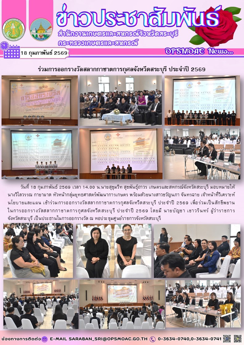 วันที่ 18 กุมภาพันธ์ 2569 เวลา 14.00 น.นายสุขุมวิท สุขพันธุ์ถาวร เกษตรและสหกรณ์จังหวัดสระบุรี มอบหมายให้ นางวิไลวรรณ กายาผาด หัวหน้ากลุ่มยุทธศาสตร์พัฒนาการเกษตร พร้อมด้วยนางสาวขวัญนภา จันทรฉาย เจ้าหน้าที่วิเคราะห์นโยบายและแผน เข้าร่วมการออกรางวัลสลากกาชาตการกุศลจังหวีดสระบุรี ประจำปี 2569 เพื่อร่วมเป็นสักขีพยาน ในการออกรางวัลสลากกาชาตการกุศลจังหวีดสระบุรี ประจำปี 2569 โดยมี นายบัญชา เชาวรินทร์ ผู้ว่าราชการ จังหวัดสระบุรี เป็นประธานในการออกรางวัล ณ หอประชุมศูนย์ราชการจังหวัดสระบุรี