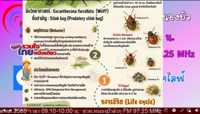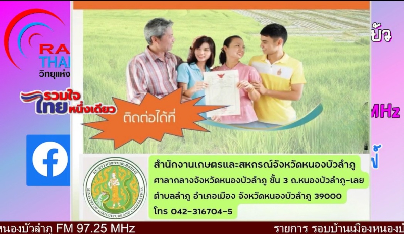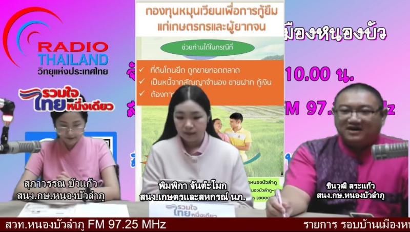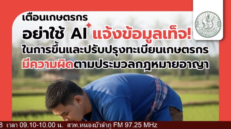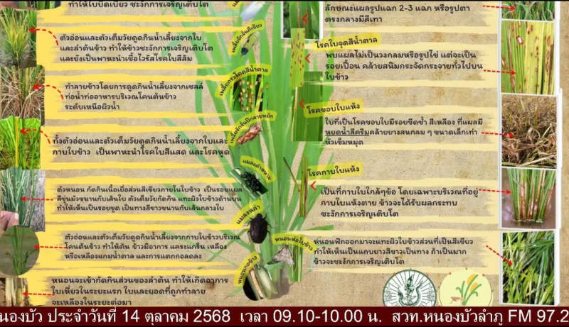 วันที่ 14 ตุลาคม 2568 เวลา 09.30 น. นายวรเชษฐ์ ชาวเหนือ เกษตรและสหกรณ์จังหวัดหนองบัวลำภู มอบหมายให้ นางสาวสุภาวรรณ บัวแก้ว นักวิเคราะห์นโยบายและแผนปฏิบัติการ นายชินวุฒ สระแก้ว นักวิเคราะห์นโยบายและแผนปฏิบัติการ ร่วมกับสำนักงานเกษตรจังหวัดหนองบัวลำภู จัดรายการวิทยุรอบบ้านเมืองหนองบัว ประจำวันอังคารที่ 14 ตุลาคม พ.ศ. 2568 ณ สถานีวิทยุกระจายเสียงแห่งประเทศไทยจังหวัดหนองบัวลำภู นำสาระความรู้ด้านการเกษตร ดังนี้ 1.พยากรณ์อากาศ 2.ประชาสัมพันธ์กองทุนหมุนเวียนเพื่อการกู้ยืมแก่เกษตรกร 3.มวนพิฆาต ฮีโร่กำจัดนอนศัตรูพืช 4.จุดรับทิ้งขยะอิเล็กทรอนิกส์ 5.แจ้งเตือนอย่าใช้ AI แจ้งข้อมูลเท็จ ในการขึ้นทะเบียนและปรับปรุงทะเบียนเกษตรกร
