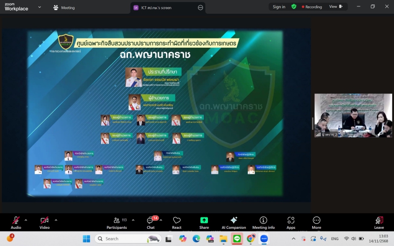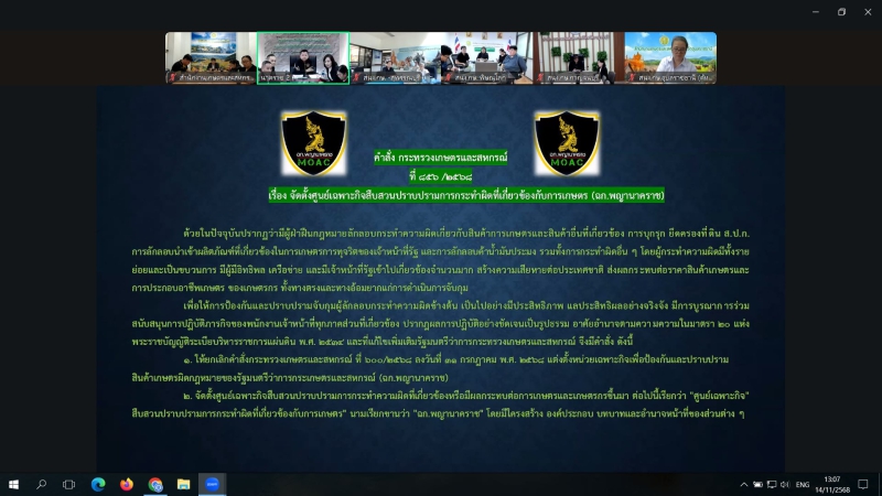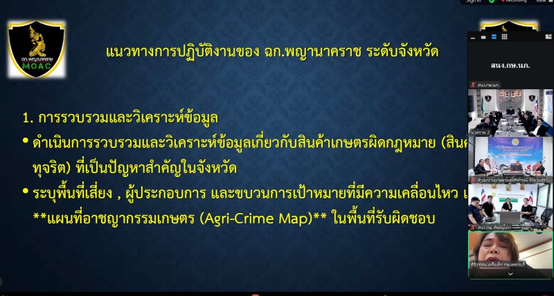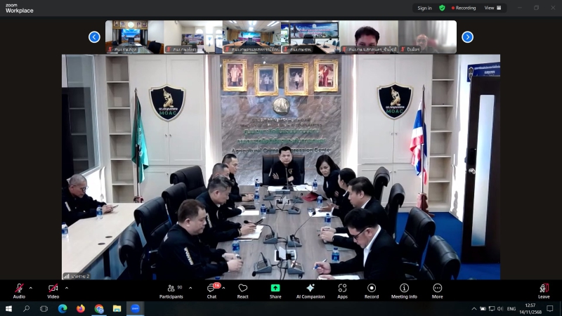 วันที่ 14 พฤศจิกายน 2568 เวลา 13.30 น. นางสาวทิพย์วรรณ อรุณศรี เกษตรและสหกรณ์จังหวัดหนองบัวลำภูมอบหมายให้ หัวหน้ากลุ่ม/ฝ่าย และเจ้าหน้าที่สำนักงานเกษตรและสหกรณ์จังหวัดหนองบัวลำภู เข้าร่วมประชุมชี้แจงแนวทางการปฏิบัติของศูนย์เฉพาะกิจสืบสวนปราบปรามการกระทำผิดที่เกี่ยวข้องกับการเกษตร (ฉก.พญานาคราช) ผ่านระบบประชุมทางไกลออนไลน์ Zoom meeting เพื่อบูรณาการการทำงานร่วมกันระหว่างหน่วยงานในสังกัดและหน่วยงานที่เกี่ยวข้อง ในการป้องกันและปราบปรามการกระทำผิดเกี่ยวกับสินค้าเกษตร และทรัพยากรทางการเกษตรอย่างมีประสิทธิภาพ โดยมี นายศรัญญู พูลลาภ ผู้ตรวจราชการกระทรวงเกษตรและสหกรณ์ เป็นประธานในการประชุม ณ สำนักงานเกษตรและสหกรณ์จังหวัดหนองบัวลำภู ชั้น 3 ศาลากลางจังหวัดหนองบัวลำภู