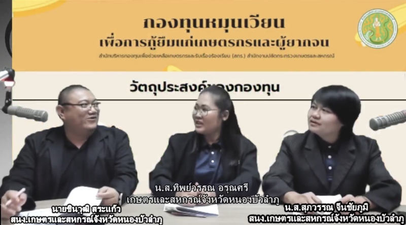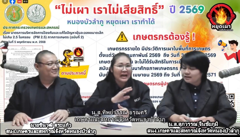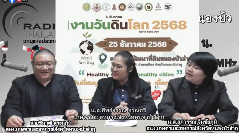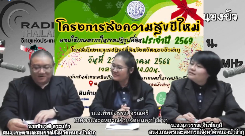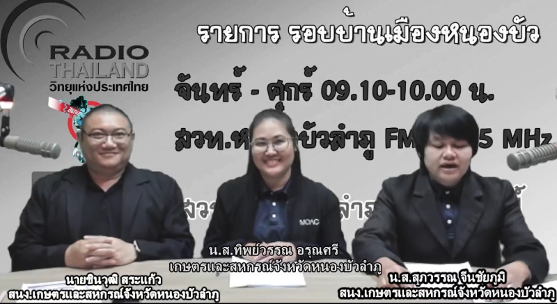 วันที่ 16 ธันวาคม 2568 เวลา 09.30 น. นางสาวทิพย์วรรณ อรุณศรี เกษตรและสหกรณ์จังหวัดหนองบัวลำภู และเจ้าหน้าที่ จัดรายการวิทยุรอบบ้านเมืองหนองบัว ประจำวันอังคารที่ 16 ธันวาคม พ.ศ. 2568 ณ สถานีวิทยุกระจายเสียงแห่งประเทศไทยจังหวัดหนองบัวลำภู นำสาระความรู้ด้านการเกษตร ดังนี้ 1. พยากรณ์อากาศเพื่อการเกษตร 7 วันข้างหน้า 2. ศูนย์บริการเกษตรพิรุณราช 3.กองทุนหมุนเวียนเพื่อการกู้ยืมแก่เกษตรกรและผู้ยากจนc]tกองทุนสงเคราะห์เกษตรกร 4. มาตรการหยุดเผาในพื้นที่เกษตรc]tแผนป้องกันและบรรเทาสาธารณภัยด้านการเกษตรในช่วงฤดูแล้ง ปี 2568/69 จังหวัดหนองบัวลำภู 5. ประชาสัมพันธ์งานวันดินโลกฯ 6.เชิญชวนอุดหนุนสินค้าของเกษตรกรในเขตปฏิรูปที่ดิน ส่งความสุขมอบให้เกษตรกรในเขตปฏิรูปที่ดิน