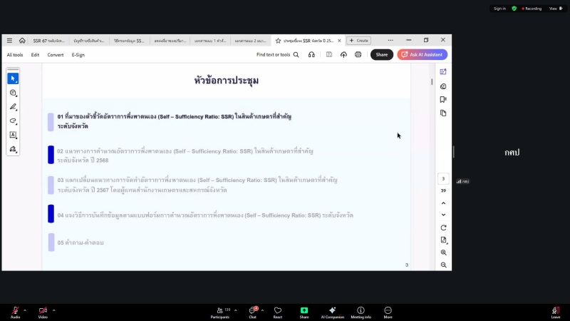 วันที่ 25 ธันวาคม 2568 เวลา 09.00 น. นางสาวทิพย์วรรณ อรุณศรี เกษตรและสหกรณ์จังหวัดหนองบัวลำภู มอบหมายให้ นางสาวฐานิกา บุญอาจ หัวหน้ากลุ่มสารสนเทศการเกษตร เข้าร่วมประชุมชี้แจงการจัดทำอัตราการพึ่งพาตนเอง (Self-Sufficiency Ratio : SSR) ในสินค้าเกษตรที่สำคัญระดับจังหวัด ปี 2569 ผ่านระบบออนไลน์ Zoom Meeting จากสำนักงานเศรษฐกิจการเกษตร ในการนี้สำนักงานเกษตรและสหกรณ์จังหวัดหนองบัวลำภูร่วมเล่าประสบการณ์ในการจัดทำ ssr ของจังหวัดหนองบัวลำภู ปี 2567 ในการประชุมในครั้งนี้ด้วย ณ สำนักงานเกษตรและสหกรณ์จังหวัดหนองบัวลำภู ชั้น 3 ศาลากลางจังหวัดหนองบัวลำภู