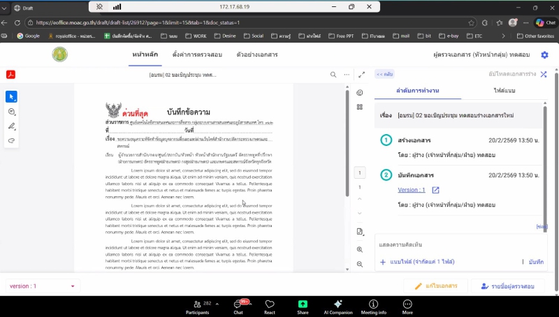 วันที่ 20 กุมภาพันธ์ 2569 เวลา 13.30 น. นางสาวทิพย์วรรณ อรุณศรี เกษตรและสหกรณ์จังหวัดหนองบัวลำภู มอบหมายให้ นางขวัญจิต ระกิติ หัวหน้าฝ่ายบริหารทั่วไป และเจ้าหน้าที่ ร่วมกิจกรรมชุมชนนักปฏิบัติ (COP) ของกองกลาง ประจำปี พ.ศ. 2569 ผ่านระบบการประชุมทางไกลออนไลน์ Zoom Meeeting เรื่อง การใช้งานระบบสารบรรณดิจิทัล (E-SARABAN) เพื่อสร้างการรับรู้ และความเข้าใจ แลกเปลี่ยนความคิดเห็น ประสบการณ์ ให้คำปรึกษาและข้อเสนอแนะในการปฏิบัติงาน ณ สำนักงานเกษตรและสหกรณ์จังหวัดหนองบัวลำภู ชั้น 3 ศาลากลางจังหวัดหนองบัวลำภู