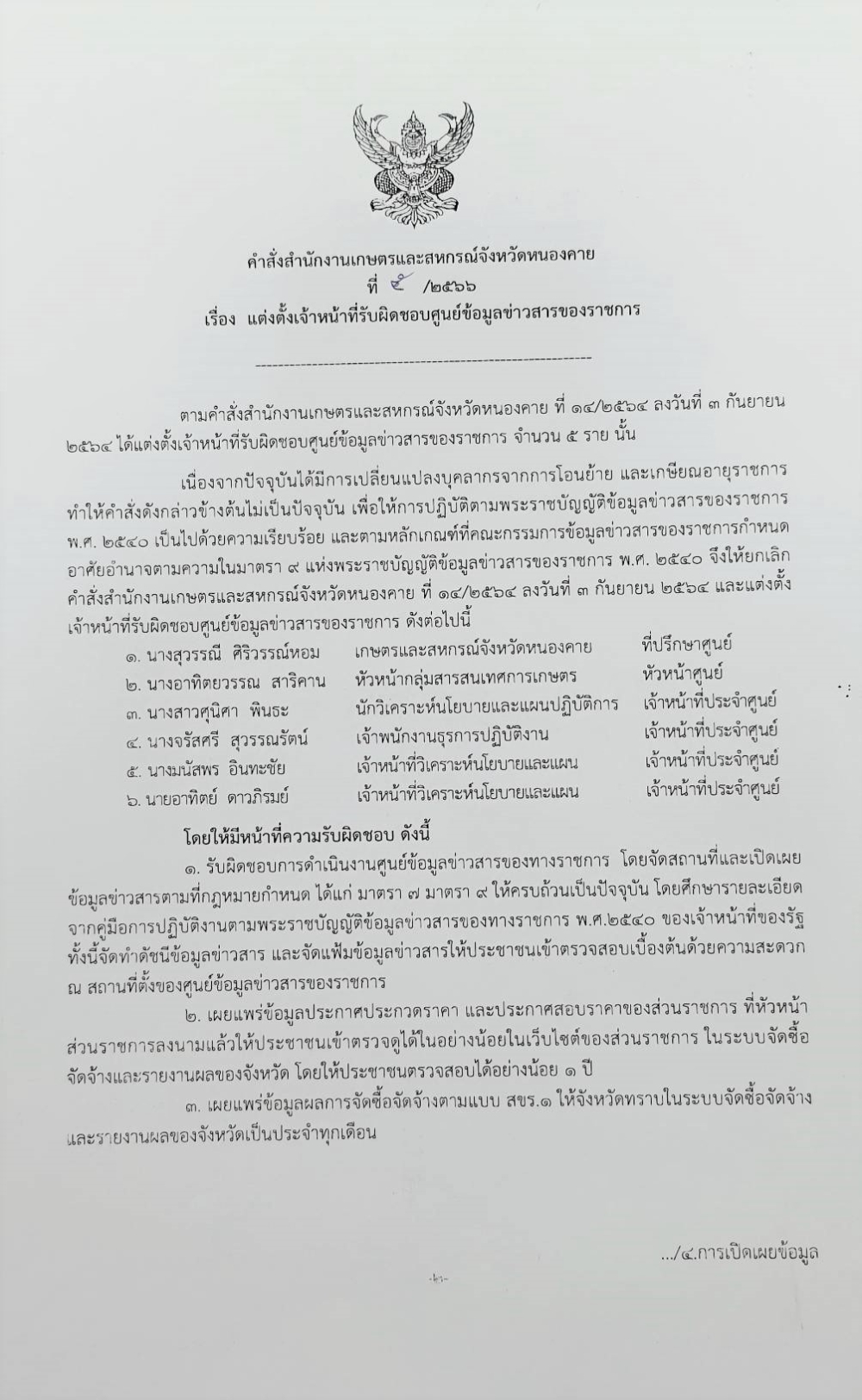 คำสั่งสำนักงานเกษตรและสหกรณ์จังหวัดหนองคาย ที่ 5/2566 เรื่อง แต่งตั้งเจ้าหน้าที่รับผิดชอบศูนย์ข้อมูลข่าวสารของราชการ