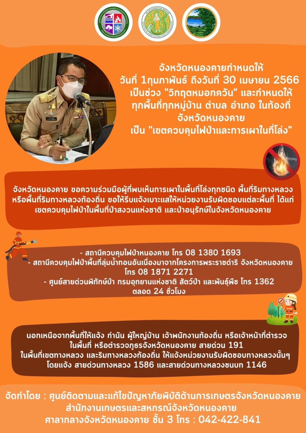 จังหวัดหนองคาย กำหนดให้ วันที่ 1 กุมภาพันธ์ ถึงวันที่ 30 เมษายน 2566 เป็นช่วง "วิกฤตหมอกควัน"