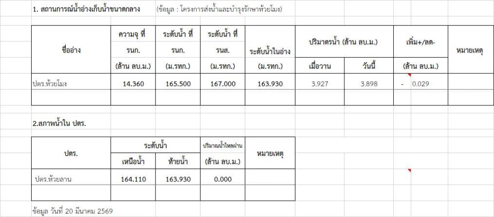รายงานสถานการณ์น้ำ คบ.ห้วยโมง วันที่ 20 มีนาคม 2569