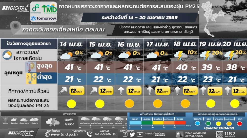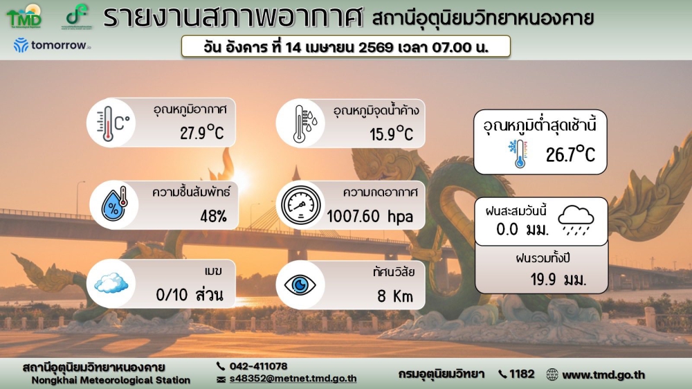 รายงานสภาพอากาศที่ส่งผลกระทบต่อจังหวัดหนองคาย ประจำวันที่ 14 เมษายน 2569