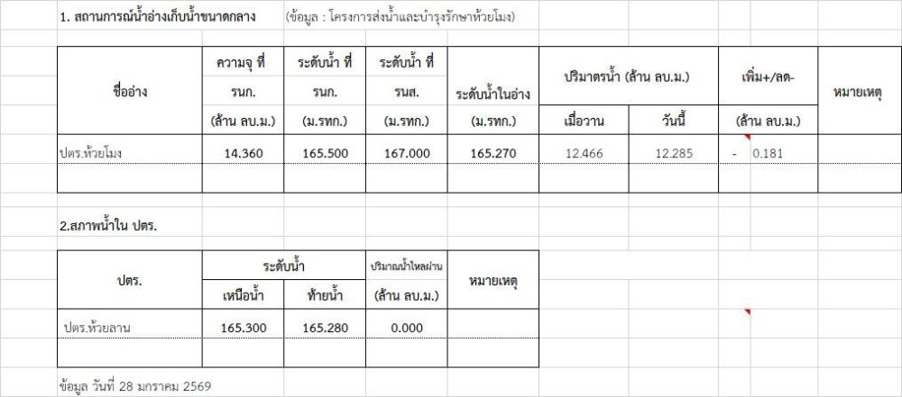 รายงานสถานการณ์โครงการส่งน้ำและบำรุงรักษาห้วยโมง ประจำวันที่ 28 มกราคม 2569