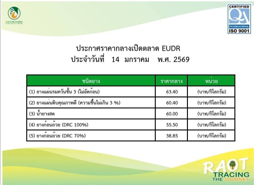 รายงานสถานการณ์ราคาเปิดตลาดกลางยาง ประจำวันที่ 14 มกราคม 2569