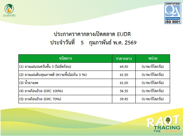 รายงานสถานการณ์ประกาศราคากลางเปิดตลาด EUDR ประจำวันที่ 5 กุมภาพันธ์ 2569