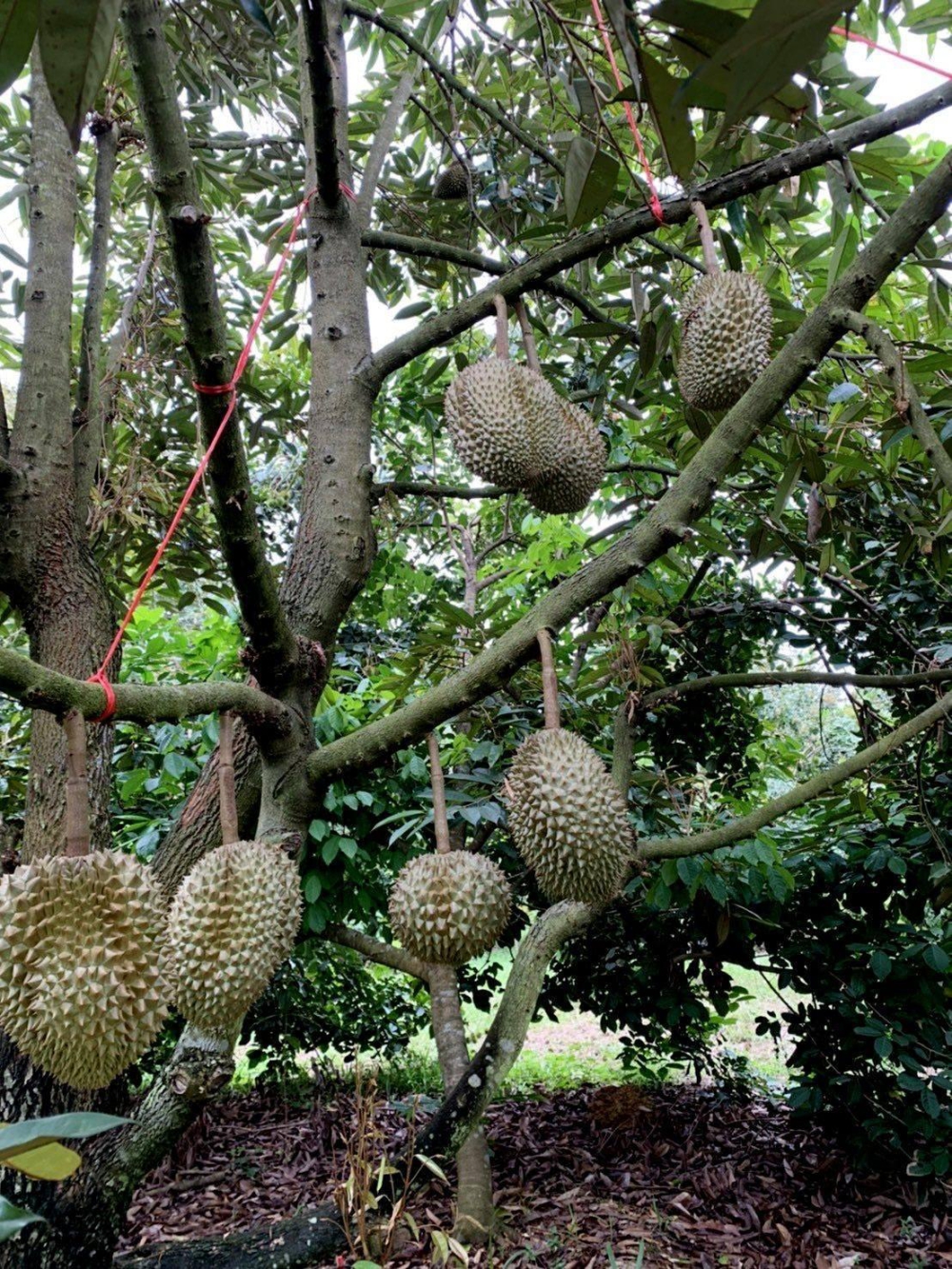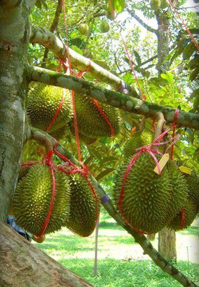 ทำการโยงกิ่งและผลทุเรียน เพื่อป้องกันความเสียหาย วิธีการโยงผลทุเรียนที่ถูกต้องสามารถลดการร่วงของผล และกิ่งหักหรือกิ่งฉีกเนื่องจากลมแรงได้ การโยงผลทุเรียนต้องผูกเชือกโยงกับกิ่งทุเรียนให้เลยตำแหน่งเชื่อมต่อระหว่างขั้วผลกับกิ่งไปทางด้าน ปลายยอดของกิ่ง โดยพยายามสอดดึงเชือกโยงเหนือกิ่งทำมุมกว้างในแนวขนานกับกิ่งนั้น แล้วดึงปลายเชือก ผูกรั้งกับต้นให้ตึงพอประมาณ สังเกตได้จากกิ่งนั้นยกระดับสูงขึ้นเล็กน้อย และสามารถเคลื่อนไหวได้ ค่อนข้างเป็นอิสระ เชือกโยงกิ่งหรือผลทุเรียนต้องเป็นวัสดุที่ทนทานต่อแรงดึงค่อนข้างสูง ควรใช้เชือกโยง หลายสีในกรณีที่มีผลทุเรียนหลายรุ่นในต้นเดียวกัน โดยแบ่งสีโยงแต่ละรุ่น เมื่อผลทุเรียนอายุประมาณ 5-6 สัปดาห์หลังดอกบาน และทำการตรวจความถูกต้องของรุ่นของผลเพื่อแยกรุ่นให้ถูกต้องยิ่งขึ้น เมื่อทุเรียนขึ้นพูอายุประมาณ 8-9 สัปดาห์หลังดอกบาน จะสามารถช่วยทำให้การเก็บเกี่ยวถูกต้อง สะดวก ไม่ต้องใช้ความชำนาญสูง