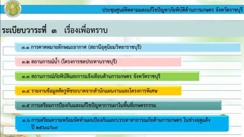 ทั้งนี้ ได้เน้นย้ำให้จัดทำแนวทางการแก้ไขปัญหาภัยพิบัติด้านการเกษตร และกำหนดระยะเวลาในการดำเนินงานให้ชัดเจน เพื่อให้การจัดทำแผนป้องกันและบรรเทาสาธารณภัยด้านการเกษตร ในช่วงฤดูแล้ง ปี 68/69 (พ.ย.68 - เม.ย.69) ของจังหวัดราชบุรี มีประสิทธิภาพ และเกิดผลสัมฤทธิ์อย่างเป็นรูปธรรม
