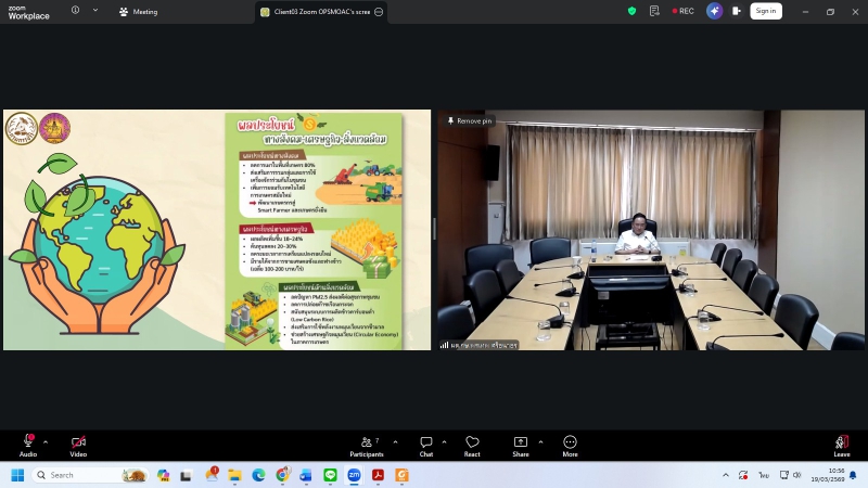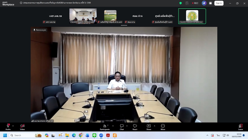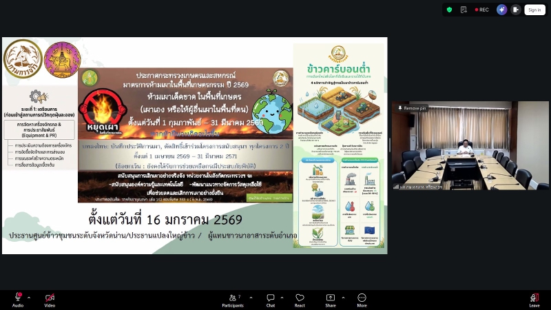 วันพฤหัสบดีที่ 19 มีนาคม 2569 เวลา 09.30 น. ดร.พรเทพ ศรีธนาธร ผู้ตรวจราชการกระทรวงเกษตรและสหกรณ์ เขตตรวจราชการที่ 16 เป็นประธานการประชุมคณะอนุกรรมการศูนย์ติดตามและแก้ไขปัญหาภัยพิบัติด้านการเกษตรจังหวัดน่าน ครั้งที่ 3/2569ผ่านระบบประชุมทางไกลออนไลน์ Zoom meeting เพื่อติดตามผลการดำเนินงานส่งเสริมการเกษตรที่ปลอดการเผาในพื้นที่เกษตรกรรม ปี 2568/69 รวมถึงเพื่อรับทราบรายงานข้อมูลสภาพอากาศ การพยากรณ์อากาศประจำเดือนของจังหวัดน่าน ข้อมูลสถานการณ์น้ำ ข้อมูลเตือนภัยด้านการเกษตร ข้อมูลสถานการณ์จุดความร้อนจังหวัดน่าน และแจ้งหลักเกณฑ์ วิธีการ เงื่อนไข การใช้จ่ายเงินทดรองราชการเพื่อช่วยเหลือผู้ประสบภัยพิบัติกรณีฉุกเฉิน พ.ศ. 2569 ที่เริ่มบังคับใช้ตั้งแต่วันที่ 6 มีนาคม 2569 พร้อมทั้งพิจารณาแนวทางการบริหารจัดการการจัดสรรน้ำสำหรับพื้นที่เสี่ยงภัยด้านการเกษตร จังหวัดน่าน และการเตรียมความพร้อมในการป้องกันและลดผลกระทบจากสถานการณ์ภัยแล้งที่จะเกิดขึ้นต่อภาคการเกษตร โดยมีนายกฤษณ อำพันธุ์ เกษตรและสหกรณ์จังหวัดน่าน พร้อมด้วยหน่วยงานที่เกี่ยวข้องเข้าร่วมการประชุมโดยพร้อมเพรียง ผู้ตรวจราชการฯได้เน้นย้ำ ให้หน่วยงานกระทรวงเกษตรและสหกรณ์พื้นที่จังหวัดน่าน บูรณาการการบริหารจัดการน้ำร่วมกับกลุ่มผู้ใช้น้ำ เกษตรกร และองค์กรปกครองส่วนท้องถิ่นในการจัดสรรน้ำ เพื่อไม่ให้มีปัญหาการแย่งน้ำกันใช้น้ำให้เกิดประสิทธิภาพอย่างสูงสุด เพื่อให้แต่ละพื้นที่สามารถมีน้ำใช้อย่างทั่วถึง ให้หน่วยงานดำเนินงานตามมาตรการของกระทรวงเกษตรและสหกรณ์ และมาตรการของจังหวัดโดยเคร่งครัด เน้นย้ำการบริหารจัดการเศษวัสดุเหลือใช้ทางการเกษตร และการประชาสัมพันธ์ให้เกษตรกรงดเว้นการเผาในพื้นที่เกษตร ตามประกาศกระทรวงเกษตรและสหกรณ์ ห้ามเผาในพื้นที่เกษตรทุกกรณีตั้งแต่วันที่ 1 กุมภาพันธ์ - 31 มีนาคม 2569 ซึ่งหากเกษตรกรรายใดมีประวัติการเผา ในช่วงเวลาดังกล่าวจะไม่ได้รับสิทธิ์เข้าร่วมโครงการสนับสนุนหรือช่วยเหลือต่าง ๆ ของกระทรวงเกษตรและสหกรณ์ทุกโครงการเป็นเวลา 2 ปี ตั้งแต่ 1 เมษายน 2569 ถึง 31 มีนาคม 2571 และให้หน่วยงานที่เกี่ยวข้องศึกษาหลักเกณฑ์ ระเบียบ คู่มือการให้ความช่วยเหลืออย่างเคร่งครัด เพื่อสามารถให้ความช่วยเหลือเกษตรกรได้อย่างรวดเร็ว ถูกต้องตามระเบียบฯ ยกเว้นการช่วยเหลือเกษตรกรผู้ประสบภัยพิบัติด้านการเกษต