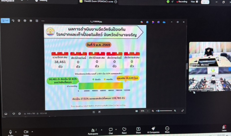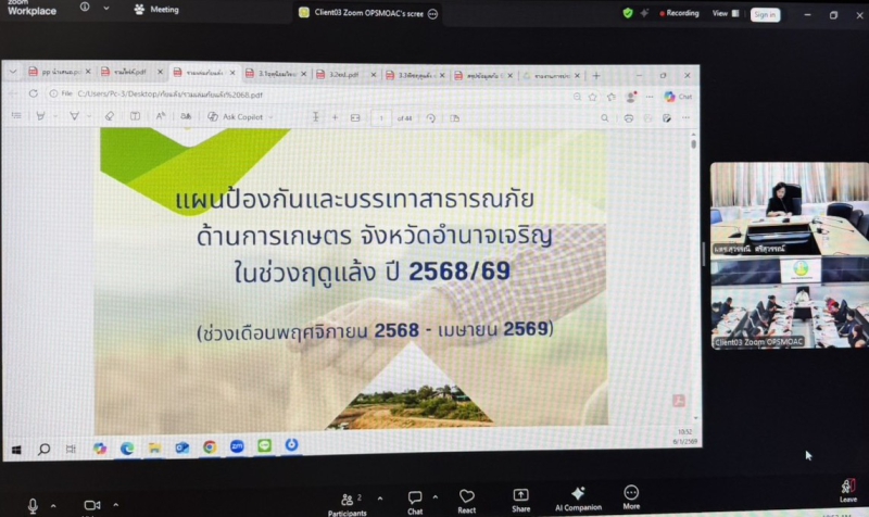 วันอังคารที่ 6 มกราคม 2569 นางสุวรรณี ศรีสุวรรณ์ ผู้ตรวจราชการกระทรวงเกษตรและสหกรณ์ เขตตรวจราชการที่ 14 เป็นประธานการประชุมคณะกรรมการบริหารศูนย์ติดตามและแก้ไขปัญหาภัยพิบัติด้านการเกษตรจังหวัดอำนาจเจริญ ครั้งที่ 1/2569 เวลา 10.00 น. ผ่านระบบประชุมออนไลน์ Application Zoom พร้อมด้วย นางปารีณา สอนอาจ เกษตรและสหกรณ์จังหวัดอำนาจเจริญ และหัวหน้าส่วนราชการ พร้อมทั้งเจ้าหน้าที่ที่เกี่ยวข้องเข้าร่วมประชุม โดยในที่ประชุมได้รับทราบการคาดหมายลักษณะอากาศ สถานการณ์น้ำ สถานการณ์และมาตราการป้องกันศัตรูพืช สถานการณ์และมาตรการป้องกันและควบคุมโรคสัตว์ สถานการณ์ด้านการประมง มาตรการป้องกันและแก้ไขปัญหาการเผาในพื้นที่เกษตรกรรม ปี 2568/69 และร่วมกันพิจารณาทบทวนร่างแผนการป้องกันและบรรเทาสาธารณภัยด้านการเกษตร จังหวัดอำนาจเจริญ ในช่วงฤดูแล้ง ปี 2568/69 (เดือนพฤศจิกายน 2568 - เมษายน 2569) ให้สามารถนำไปปฏิบัติได้จริง แก้ไขปัญหาได้อย่างทันท่วงที และเห็นผลเป็นรูปธรรม
