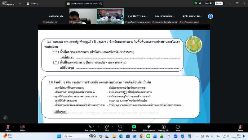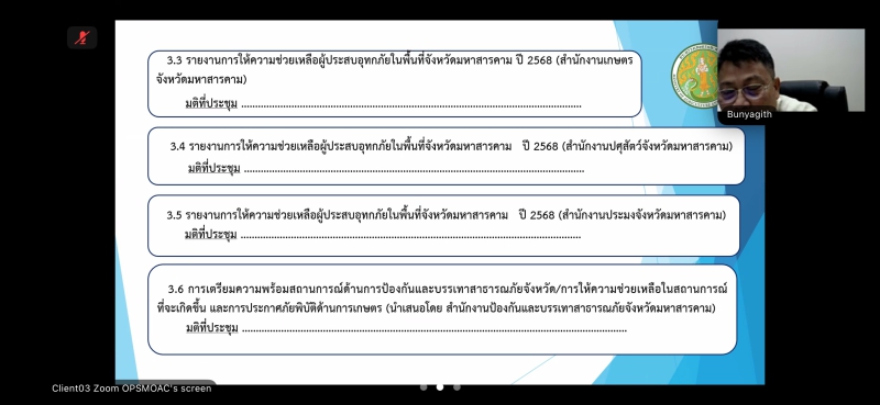 วันอังคารที่ 6 มกราคม 2569 นายบุญญกฤช ปิ่นประสงค์ ผู้ตรวจราชการกระทรวงเกษตรและสหกรณ์ เขตตรวจราชการที่ 12 เป็นประธานการประชุมคณะกรรมการศูนย์ติดตามและแก้ไขปัญหาภัยพิบัติด้านการเกษตรจังหวัดมหาสารคาม ครั้งที่ 1/2569 เวลา 13.30 น. ผ่านระบบประชุมออนไลน์ Application Zoom พร้อมด้วย นางสาวอัมพรพรรณ อภิรักษากร เกษตรและสหกรณ์จังหวัดมหาสารคาม ในฐานะฝ่ายเลขานุการการประชุมฯ คณะกรรมการศูนย์ติดตามและแก้ไขปัญหาภัยพิบัติด้านการเกษตรฯ และเจ้าหน้าที่ที่เกี่ยวข้องเข้าร่วมประชุมคณะกรรมการศูนย์ติดตามและแก้ไขปัญหาภัยพิบัติด้านการเกษตรจังหวัดมหาสารคาม โดยในที่ประชุมได้รับทราบการคาดหมายลักษณะอากาศ สถานการณ์น้ำ สถานการณ์และมาตราการป้องกันศัตรูพืช สถานการณ์และมาตรการป้องกันและควบคุมโรคสัตว์ สถานการณ์ด้านการประมง มาตรการป้องกันและแก้ไขปัญหาการเผาในพื้นที่เกษตรกรรม ปี 2568/69 และขอให้เจ้าหน้าที่ทำความเข้าใจเกี่ยวกับแผนป้องกันและบรรเทาสาธารณภัยด้านการเกษตร ในช่วงฤดูแล้ง ปี 2568/69 (เดือนพฤศจิกายน 2568 - เมษายน 2569) จังหวัดมหาสารคาม เพื่อใช้เป็นกรอบแนวทางการดำเนินงานในการเตรียมความพร้อมในการป้องกันและลดผลกระทบจากปัญหาภัยพิบัติด้านการเกษตรและช่วยบรรเทาความเสียหายต่อพื้นที่การเกษตรที่อาจจะเกิดขึ้น รวมทั้งเพื่อให้การช่วยเหลือเกษตรกรผู้ประสบภัยเป็นไปอย่างรวดเร็วและมีประสิทธิภาพตลอดจนเป็นกรอบแนวทางในการบูรณาการร่วมกับหน่วยงานอื่นๆ ที่เกี่ยวข้องให้เห็นผลเป็นรูปธรรมต่อไป