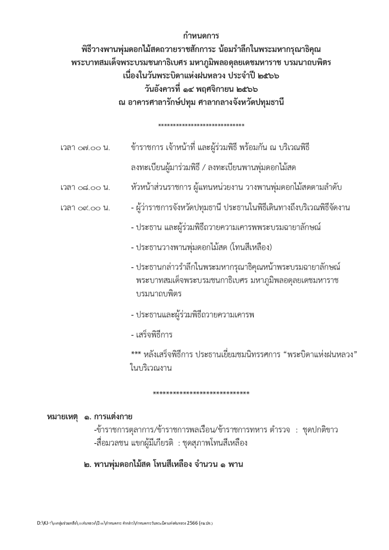 กำหนดการพิธีวางพานพุ่มดอกไม้สดถวายราชสักการะ น้อมรำลึกในพระมหากรุณาธิคุณพระบาทสมเด็จพระบรมชนกาธิเบศร มหาภูมิพลอดุลยเดชมหาราช บรมนาถบพิตร