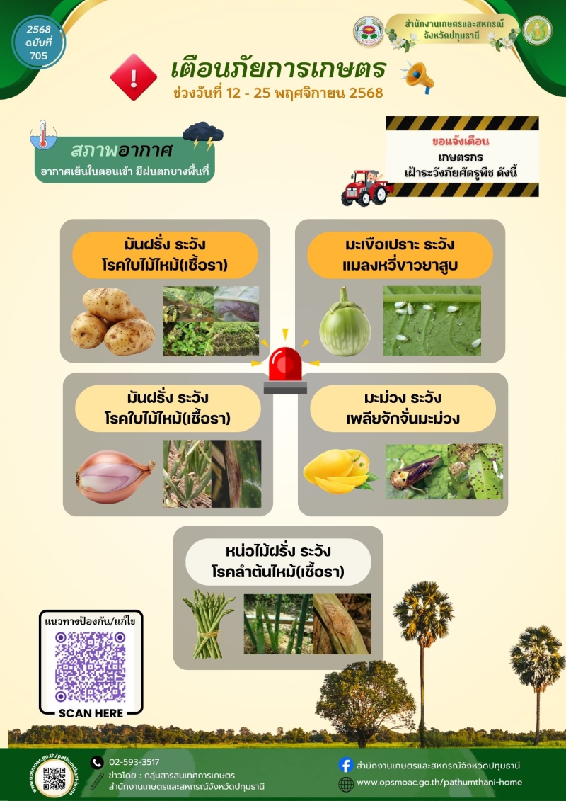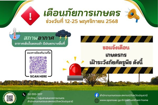 ด่วน! เตือนภัยเกษตรกรปทุมธานี เตรียมรับมือช่วง 12-25 พฤศจิกายน 68