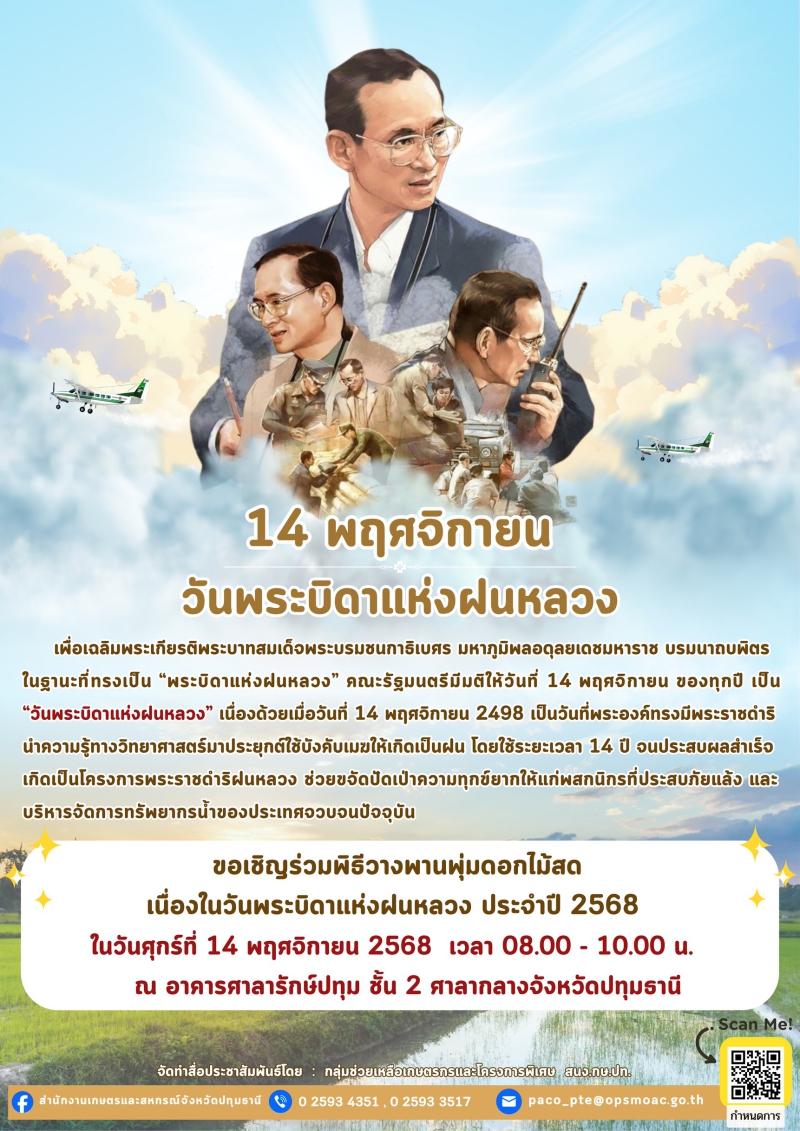 ขอเชิญร่วมพิธีวางพานพุ่มดอกไม้สด เนื่องในวันพระบิดาแห่งฝนหลวง ประจำปี 2568