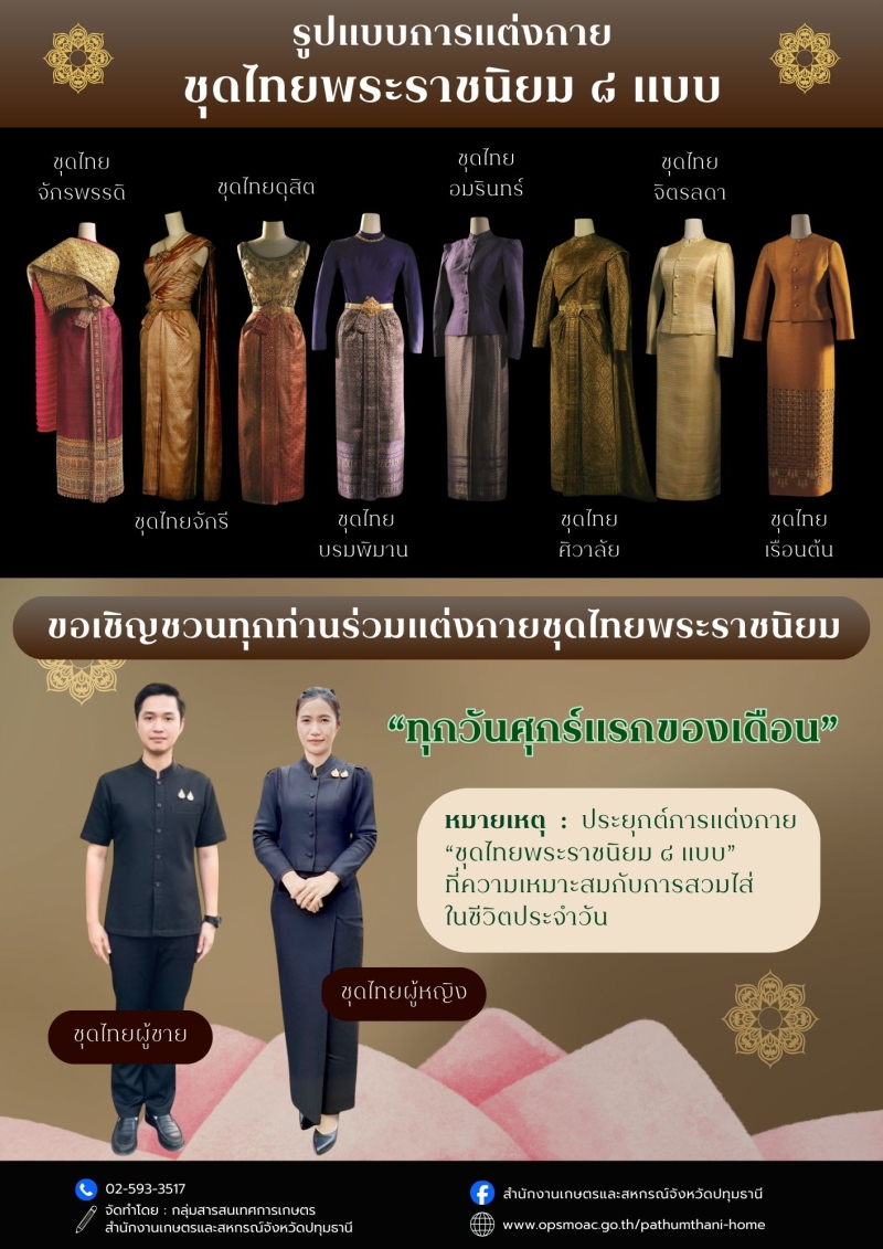 5. ชุดไทยอมรินทร์ ตั้งชื่อตามพระที่นั่งอมรินทร์วินิจฉัย แบบเหมือนไทยจิตรลดา ต่างกันที่ใช้ผ้าและเครื่องประดับหรูหรากว่าไทยจิตรลดา ใช้ผ้าไหมยกดอกที่มีทองแกมหรือยกทองทั้งตัว เสื้อคนละท่อนกับซิ่น ไม่มีเข็มขัด ใช้สำหรับพิธีตอนค่ำ เหมาะสมสำหรับงานเลี้ยงรับรองรับเสด็จ ไปดูละครตอนค่ำ และ เฉพาะในงานพระราชพิธีสวนสนามในวันเฉลิมพระชนมพรรษา ประดับเครื่องราชอิสริยาภรณ์ หรือ ใช้ในโอกาสพิเศษที่กำหนดให้แต่งกายเต็มยศหรือครึ่งยศ เช่น ในงานพระราชพิธีหรืองานสโมสรสันนิบาต