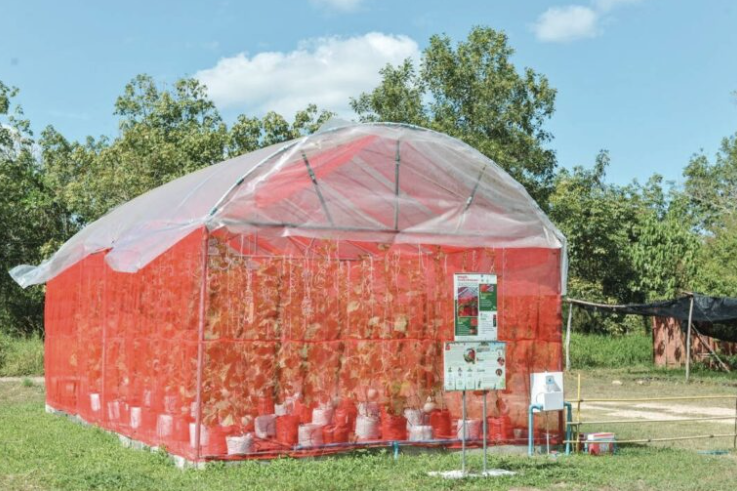 โดยตาข่ายพรางแสงสีแดง (shed net/insect net) จะช่วยคัดเลือกช่วงคลื่นแสงที่เหมาะสม และป้องกันไม่ให้แมลงรบกวนพืชได้ มีการปรับขนาดของรู สีของตาข่าย และทดสอบการเข้าทำลายของแมลง ตาข่ายสีแดงลดการเข้าทำลายของแมลงได้ถึง 80% เมื่อเทียบกับตาข่ายสีขาว