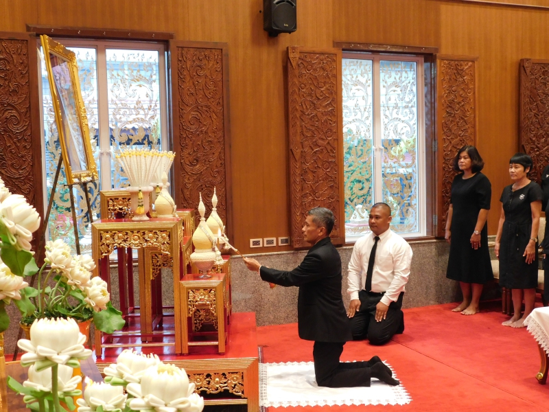 พิธีเริ่มจาก นายฉลาด แก้วขาว เกษตรและสหกรณ์จังหวัดปัตตานี ประธานในพิธี จุดธูป เทียน บูชาพระรัตนตรัย จุดเครื่องบูชาทองน้อย หน้าพระฉายาลักษณ์สมเด็จพระนางเจ้าสิริกิติ์ พระบรมราชินีนาถ พระบรมราชชนนีพันปีหลวง เจ้าหน้าที่อาราธนาศีล พระสงฆ์ให้ศีล เจ้าหน้าที่อาราธนาธรรม พระสงฆ์ 4 รูป สวดพระอภิธรรม ประธานในพิธี และหัวหน้าส่วนราชการฯ จำนวน 4 ท่าน ทอดผ้าบังสุกุล พระสงฆ์สดับปกรณ์ อนุโมทนาประธานในพิธีกรวดน้ำ รับพร ประธานในพิธีกราบพระรัตนตรัย กราบเบื้องหน้าพระฉายาลักษณ์ และกราบลาประธานสงฆ์ เป็นอันเสร็จพิธี