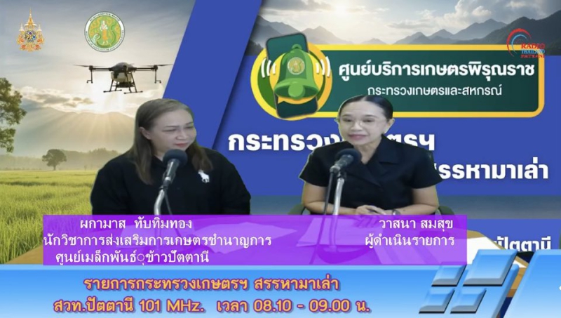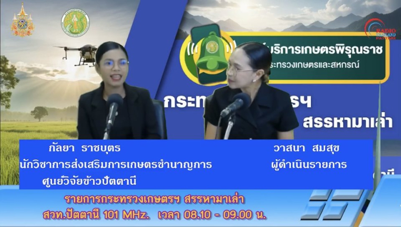 วันจันทร์ ที่ 17 พฤศจิกายน 2568 เวลา 08.10 น. นายฉลาด แก้วขาว เกษตรและสหกรณ์จังหวัดปัตตานี มอบหมายให้กลุ่มสารสนเทศการเกษตร จัดรายการวิทยุ “กระทรวงเกษตรฯ สรรหามาเล่า” โดยมีนางสาวกัลยา ราชบุตร นักวิชาการเกษตรชำนาญการ จากศูนย์วิจัยข้าวปัตตานี นางสาวผกามาส ทับทิมทอง นักวิชาการส่งเสริมการเกษตรชำนาญการ จากศูนย์เมล็ดพันธุ์ข้าวปัตตานี โดยมีนางสาววาสนา สมสุข นักวิเคราะห์นโยบายและแผนชำนาญการ จากสำนักงานเกษตรและสหกรณ์จังหวัดปัตตานี ทำหน้าที่เป็นผู้ดำเนินรายการ ทางสถานีวิทยุกระจายเสียงแห่งประเทศไทยจังหวัดปัตตานี คลื่น F.M. 101 MHz ซึ่งออกอากาศทุกวันจันทร์ เวลา 08.10–09.00 น. และไลฟ์สดทาง Facebook Live สวท.ปัตตานี F.M. 101