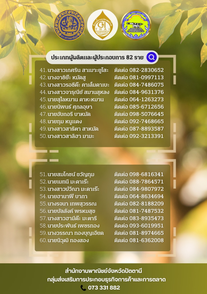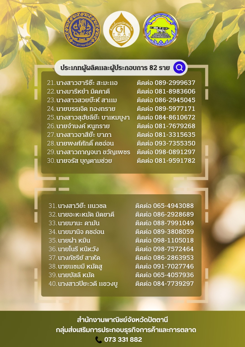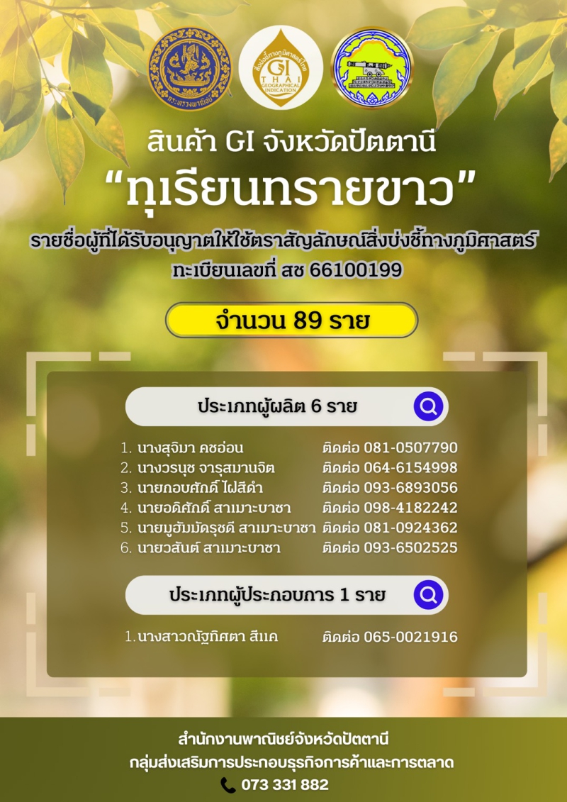 รายชื่อผู้ผลิตและผู้ประกอบการที่ได้รับหนังสืออนุญาตให้ใช้ตราสัญลักษณ์สิ่งบ่งชี้ทางภูมิศาสตร์ (GI) สินค้า “ทุเรียนทรายขาว” จังหวัดปัตตานี ประจำปี 2568 ซึ่งเป็นสินค้าสิ่งบ่งชี้ทางภูมิศาสตร์ (GI) ลำดับที่ 199 ของประเทศไทย