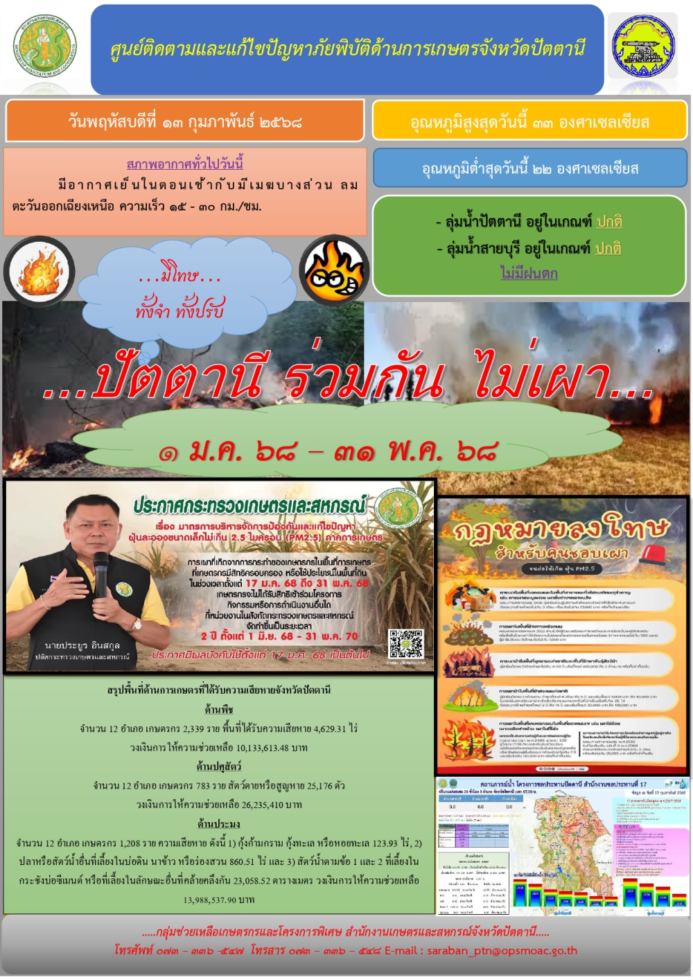 วันพฤหัสบดี ที่ 13 กุมภาพันธ์ 2568 ศูนย์ติดตามและแก้ไขปัญหาภัยพิบัติด้านการเกษตรจังหวัดปัตตานี