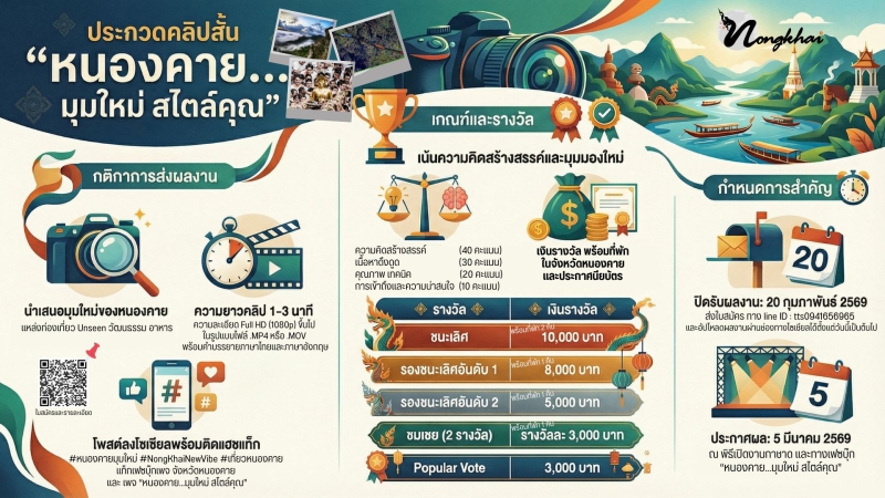 การประกวดคลิปวิดีโอสั้นประชาสัมพันธ์การท่องเที่ยวจังหวัดหนองคาย ภายใต้หัวข้อ "หนองคาย...มุมใหม่ สไตล์คุณ" (ตั้งแต่บัดนี้จนถึงวันที่ 20 กุมภาพันธ์ 2569))