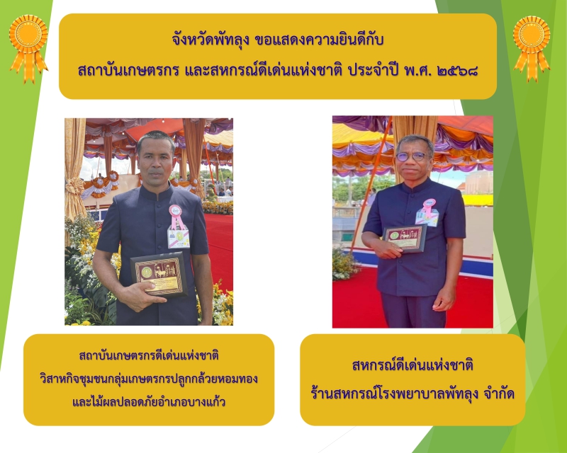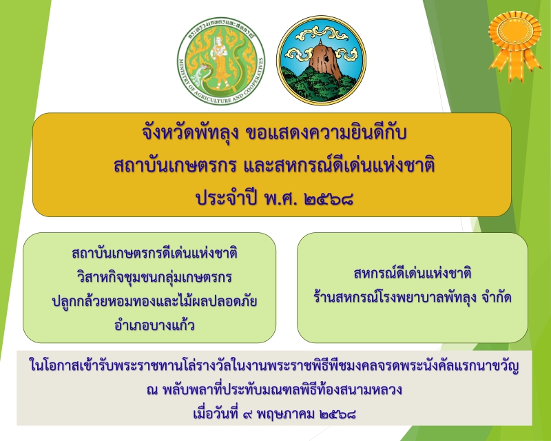 จังหวัดพัทลุง ขอแสดงความยินดีกับ สถาบันเกษตรกร และสหกรณ์ดีเด่นแห่งชาติ ประจำปีงบประมาณ พ.ศ. 2568